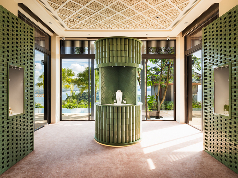ถัดมาคือ ห้อง “Ceramics” วัสดุที่เหล่าพ่อค้าจากจีนนำเข้ามาสู่ภูเก็ตในสมัยยุคเหมืองแร่ เซรามิกสีเขียวถูกร้อยเรียงในรูปทรงเรขาคณิตอย่างประณีต สร้างคอนทราสต์ให้กับชิ้นงานไฮจิวเวลรีที่จัดแสดง คอลเลคชั่นไฮไลท์ในห้องนี้ ได้แก่ แหวน Tichodroma ที่โดดเด่นด้วยรูเบลไลท์ (ทัวร์มาลีนสีแดง) ทรงหลังเบี้ยที่งดงามไร้ที่ติ ขนาด 10.06 กะรัต จัดแสดงอยู่ท่ามกลางชิ้นงานจากคอลเลคชั่น Panthère de Cartier ซึ่งรวมถึงสร้อยคอ Pompon, สร้อยคอ Panthère des Neiges, สร้อยคอ Ti Panthère และเรือนเวลา Tiny Tiger (เรือนเวลาจากคอลเลคชั่นเครื่องประดับชั้นสูง) นอกจากนี้ยังมีกำไลหลากดีไซน์จากคอลเลคชั่น Indomptables de Cartier ที่นำเอาสัตว์ป่านานาพันธุ์ของ Cartier มาผสานรวมกันในหนึ่งครีเอชั่น