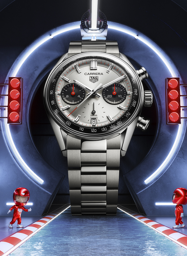 เริ่มต้นกันด้วยเรือนเวลาระดับไอคอนที่เหมาะกับทั้งสุภาพบุรุษและสุภาพสตรี นาฬิการุ่น TAG Heuer Carrera Chronograph โดดเด่นด้วยหน้าปัดแพนด้าในดีไซน์ bi-compax ที่เป็นเอกลักษณ์เฉพาะของ TAG Heuer มาพร้อมหน้าปัดสีเงินขัดลายซันเรย์คู่กับหน้าปัดย่อยสีดำสองหน้าปัด สร้างความโดดเด่นและตัดกันอย่างลงตัว ทำให้หน้าปัดดูสะดุดตาคล้ายกับแพนด้า ตัวเรือนมาพร้อมขอบหน้าปัดโค้งมนและกระจกคริสตัลแซฟไฟร์ทรงโดม ช่วยเพิ่มความชัดเจนในการอ่านเวลา และเป็นครั้งแรกที่สายนาฬิกาสตีลสามแถวถูกนำมาใช้กับนาฬิการุ่น TAG Heuer Carrera ขนาด 39 มม. อีกด้วย