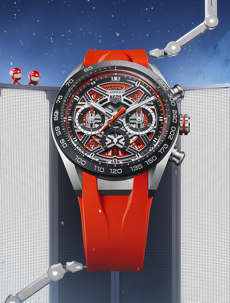 ตามมาด้วยนาฬิการุ่นที่ตอบโจทย์สุภาพบุรุษสายสปอร์ต นาฬิการุ่น TAG Heuer Carrera Chronograph Extreme Sport ที่โดดเด่นด้วยความเที่ยงตรงและดีไซน์หน้าปัดแบบ Skeleton หรือหน้าปัดเปลือย เผยให้เห็นกลไกอันซับซ้อนภายในที่สะท้อนถึงความหลงใหลและพลัง ตัวเรือนผลิตจากไทเทเนียมเกรดพรีเมียม แข็งแกร่งและทนทาน พร้อมสีส้มสดใสที่สื่อถึงความเร็วและความสง่างามในทุกมุมมอง ฝาหลังทำด้วยกระจกคริสตัลแซฟไฟร์ มีความโปร่งใสเผยให้เห็นกลไก TH 20-00 ซึ่งสะท้อนถึงจิตวิญญาณแห่งความกล้าหาญของนาฬิกาเรือนนี้