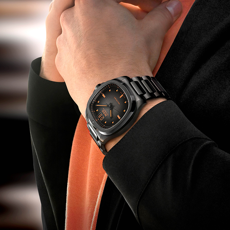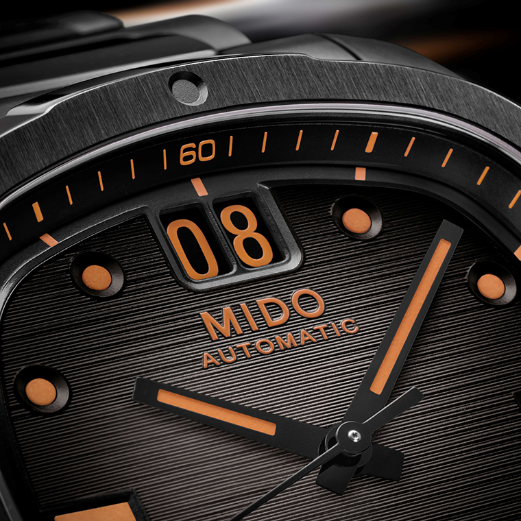 สำหรับดีไซน์ล่าสุดของเรือนเวลาคอลเลกชั่น “มัลติฟอร์ท ทีวี บิ๊ก เดท” (Multifort TV Big Date) ทางแบรนด์ “มิโด” (MIDO) ได้ตีความใหม่โดยหยิบยกรูปทรงอันคลาสสิกของกรอบโทรทัศน์ในสไตล์วินเทจ พร้อมกับนำสีสันประจำแบรนด์ “มิโด” (MIDO) อย่างโทนสีส้มและดำ ซึ่งเป็นคู่สีที่มีความโดดเด่นและสร้างความคอนทราสต์ที่สะดุดตาแต่ทว่าดูลงตัวกันอย่างสวยงาม ตกแต่งบริเวณหน้าปัดแบบขัดลายแนวนอนเกิดเป็นเอฟเฟ็กต์ลายเส้นที่ไล่สีจากเทาไปจนเป็นสีดำเข้มอย่างงดงาม ในขณะที่ช่องแสดงวันที่ (Date) ขนาดใหญ่ ถูกวางไว้ตรงตำแหน่ง 12 นาฬิกา พร้อมการแต่งแต้มให้ดูโดดเด่นในเฉดสีส้ม ซึ่งเป็นเอกลักษณ์ของคอลเลกชั่นนี้ ส่วนตัวเรือนและสายนาฬิกาผลิตจากสแตนเลสสตีลที่เคลือบด้วย PVD สีดำช่วยเสริมรูปลักษณ์ให้ดูมีความทันสมัยมากยิ่งขึ้น ด้านเข็มนาฬิกาทั้งเข็มนาทีและชั่วโมงถูกเคลือบด้วยสารเรืองแสงซูเปอร์ ลูมิโนวา (Super-LumiNova®) สีส้มสดใส ช่วยอ่านค่าในที่แสงน้อยหรือยามค่ำคืน ด้านฝาหลังดีไซน์แบบโปร่งใสที่เผยให้เห็นการทำงานของกลไกคาลิเบอร์ 80 (Caliber 80) รุ่นล่าสุด ที่มีความแม่นยำและความน่าเชื่อถืออย่างน่าทึ่ง ด้วยการสำรองพลังงานสูงสุดถึง 80 ชั่วโมง นอกจากนี้ยังเสริมความแข็งแรงด้วยบาลานซ์สปริงที่ผลิตจากนิวาครอง (Nivachron™) ใช้เทคโนโลยีสูง เพื่อเสริมความแข็งแรงทนทานต่อแรงกระแทกและสนามแม่เหล็กได้เป็นอย่างดี พร้อมคุณสมบัติกันน้ำลึกได้ถึง 10 บาร์/100 เมตร
