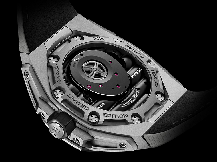 ฝาหลังประดับแซฟไฟร์เผยให้เห็นบริดจ์ไทเทเนียมเคลือบพีวีดีสีดําาของกลไก ซึ่งดีไซน์ของการเคลือบและบุวัสดุในส่วนนี้ยังเป็นการหยิบเอาแรงบันดาลใจจากคาแรกเตอร์หุ่นของ KAWS มาใช้ได้อย่างโดดเด่น บริดจ์ชุดเฟืองเกียร์ (gear train bridge) เปิดออกสู่วงล้อเฟือง (rachet wheel) ที่ทําหน้าที่รับน้ำหนัก แกนเพลา (barrel-arbour) เมื่อไขลานนาฬิกา และถูกขีดฆ่าเพื่อจําลองสัญลักษณ์ X ของ KAWS นอกจากนี้ ยังสามารถมองเห็นเสียงคลิกที่ป้องกันไม่ให้กลไกหมุนไปในทิศทางคลายเกลียวได้ที่ตําแหน่ง 12 นาฬิกา บริดจ์สีดําขลับถูกคอนทราสต์ด้วยรายละเอียดของคําต่างๆ ทั้ง “Swiss” “39 jewels” และโลโก้ “Audemars Piguet” ซึ่งทั้งหมดสลักด้วยเลเซอร์แล้วเคลือบ ด้วยแลคเกอร์สีขาว