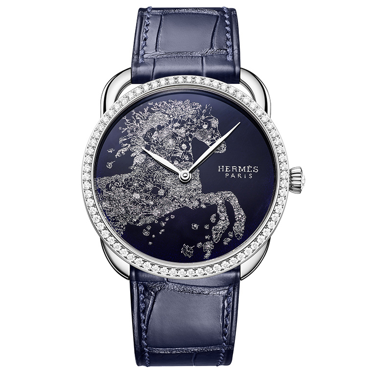 นาฬิกา อาร์โซ (Arceau) ทรงกลมมนพร้อมด้วยหูตัวเรือนทรงโกลนอสมมาตรที่สร้างสรรค์ขึ้นโดย อองรี ดอริญี (Henri d’Origny) ในปี ค.ศ. 1978 ได้ปรากฏโฉมภายใต้การตีความและรังสรรค์ขึ้นใหม่อย่างประณีตละเอียดอ่อน พร้อมเป็นตัวแทนอันมีชีวิตชีวาของสไตล์แห่ง แอร์เมส (Hermès) กับตัวเรือนทองเพรียวบางและประดับด้วยเพชรที่ห้อมล้อมหน้าปัดลวดลายปักของม้าสีเงินอันงามสง่า