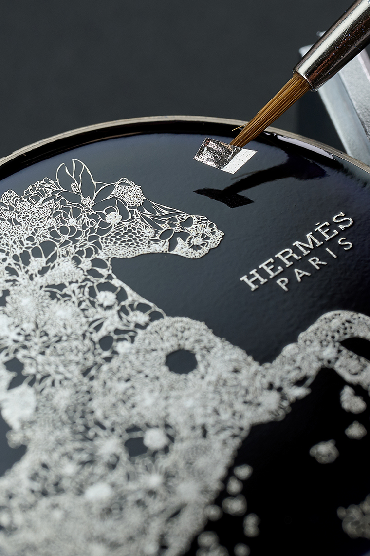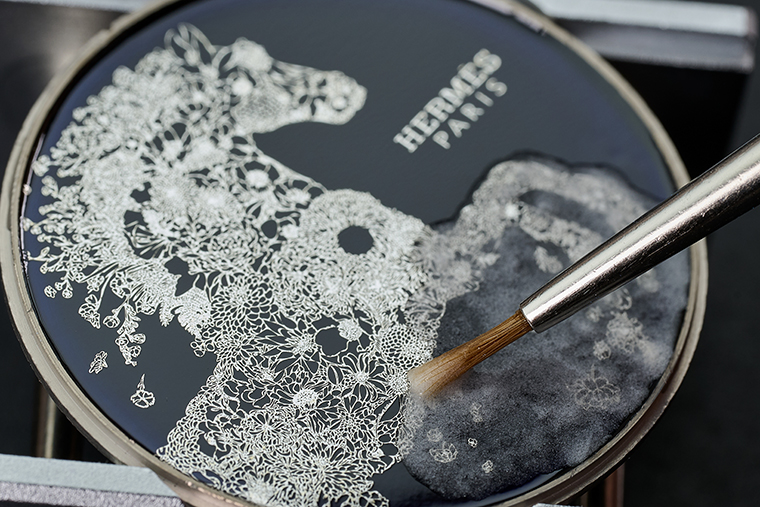 ภาพของม้าที่ปรากฏราวกับกำลังกระโจนล่องสายลมได้เผยให้เห็นถึงอาภรณ์เครื่องแต่งกายอันหรูหราเปล่งประกายและปลิวล่องไปตามแรงลม เพื่อสร้างสรรค์ลวดลายดอกไม้นี้ ศิลปินได้ใช้พู่กันในการบรรจงลงยาสีเข้มไว้บนฐานซึ่งประกอบด้วยผงแก้วสีที่ถูกบดละเอียดผสมเข้ากับน้ำมันธรรมชาติ ก่อนจะทำให้แห้งและผ่านการเผาในเตาอบเพื่อเป็นการยึดเม็ดสีต่าง ๆ จากนั้นมวลดอกไม้จึงถูกขึ้นรูปร่างจากแผ่นเงินและนำมาประดับตกแต่งบนงานลงยา ก่อนจะค่อย ๆ โปรยปรายไปด้วยเกล็ดเงินเล็ก ๆ โดยการเผาอย่างต่อเนื่อง