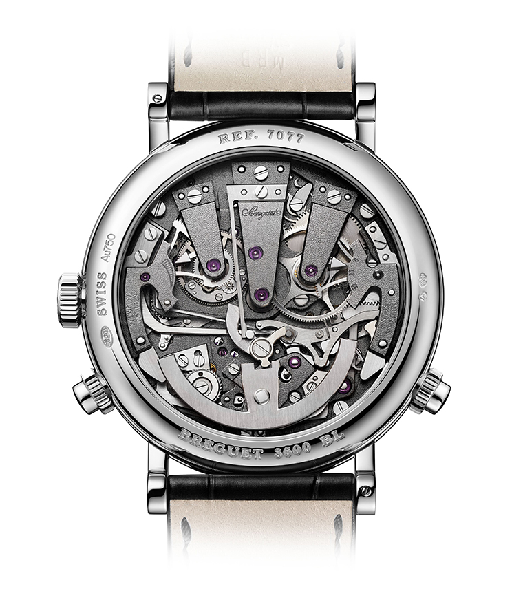 โดยทั่วไป ระบบเกียร์ชุดที่สองจำเป็นจะต้องมีกระปุกลานเพิ่ม ซึ่งทำให้กินพื้นที่มากขึ้นและต้องไขลานทั้งสองส่วนคือทั้งโครโนกราฟและกระปุกลานแสดงเวลา แต่สำหรับ Tradition Chronographe Indépendant 7077 Breguet ใช้ลานเพียงชุดเดียวเท่านั้นพร้อมด้วยสปริงที่เหมาะกับฟังก์ชันโครโนกราฟ