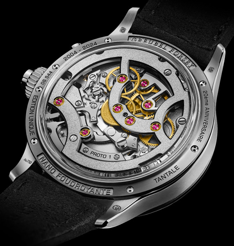 ตัวเรือนไวท์โกลด์สร้างความน่าตื่นตาตื่นใจด้วยชิ้นส่วนของขอบและฝาหลังที่ผลิตจากแทนทาลัม ซึ่งนับเป็นครั้งแรกของ Greubel Forsey เพราะแบรนด์ไม่เคยใช้วัสดุนี้มาก่อน แทนทาลัมเป็นวัสดุที่ขึ้นชื่อในเรื่องความแวววาว ให้โทนสีเทาอมฟ้าและความซับซ้อนในการสร้างสรรค์ชิ้นงาน (โดยมีจุดหลอมเหลวสูงกว่า 3,000°C) ต้องใช้ความชำนาญพิเศษที่หายาก และทางแบรนด์ยังคงรักษาเอกลักษณ์ด้านสุนทรียศาสตร์ที่สำคัญเอาไว้ รวมทั้งการแกะสลักนูนตัวอักษร “Nano Foudroyante” และ “Greubel Forsey” พร้อมการขัดเงาโดยอยู่บนหน้าปัดที่ผลิตจากไวท์โกลด์ผ่านการใช้สลักด้วยมือและขัดด้วยลายซาติน สถาปัตยกรรมของกลไกมีความยอดเยี่ยม โดยผลงานชิ้นเอกนี้แสดงให้เห็นถึงชิ้นส่วนกลไกที่อยู่รอบชุดเฟืองคอลัมน์วีล ซึ่งมากับรูปทรงเรขาคณิตแบบโมโนบล็อก 3 มิติที่หายาก และสามารถมองเห็นได้ผ่านทางฝาหลังนาฬิกา