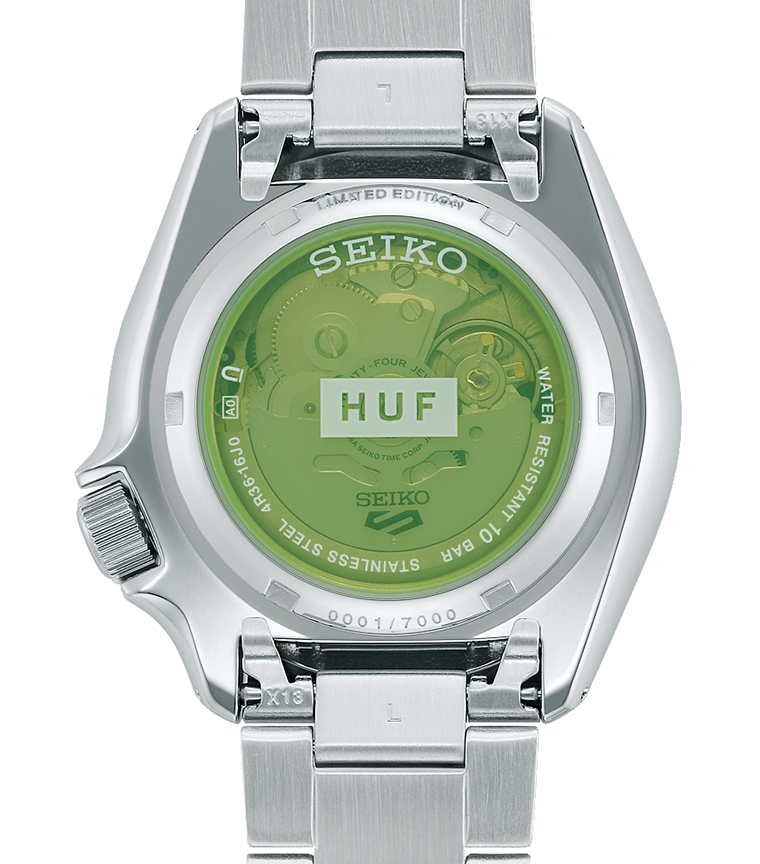 ปิดท้ายความพิเศษของการคอลแลปร่วมกันครั้งนี้ ด้วยฝาหลังแบบ See-through สี HUF Green พร้อมกล่องพิเศษและสติ๊กเกอร์ เฉพาะ Seiko 5 Sports HUF Limited Edition ที่ประดับโลโก้ของทั้งสอง แบรนด์เข้าไว้ด้วยกัน และระบุหมายเลขประจำตัวเรือน ที่ผลิตจำนวนจำกัดเพียง 7,000 เรือนทั่วโลกเท่านั้น