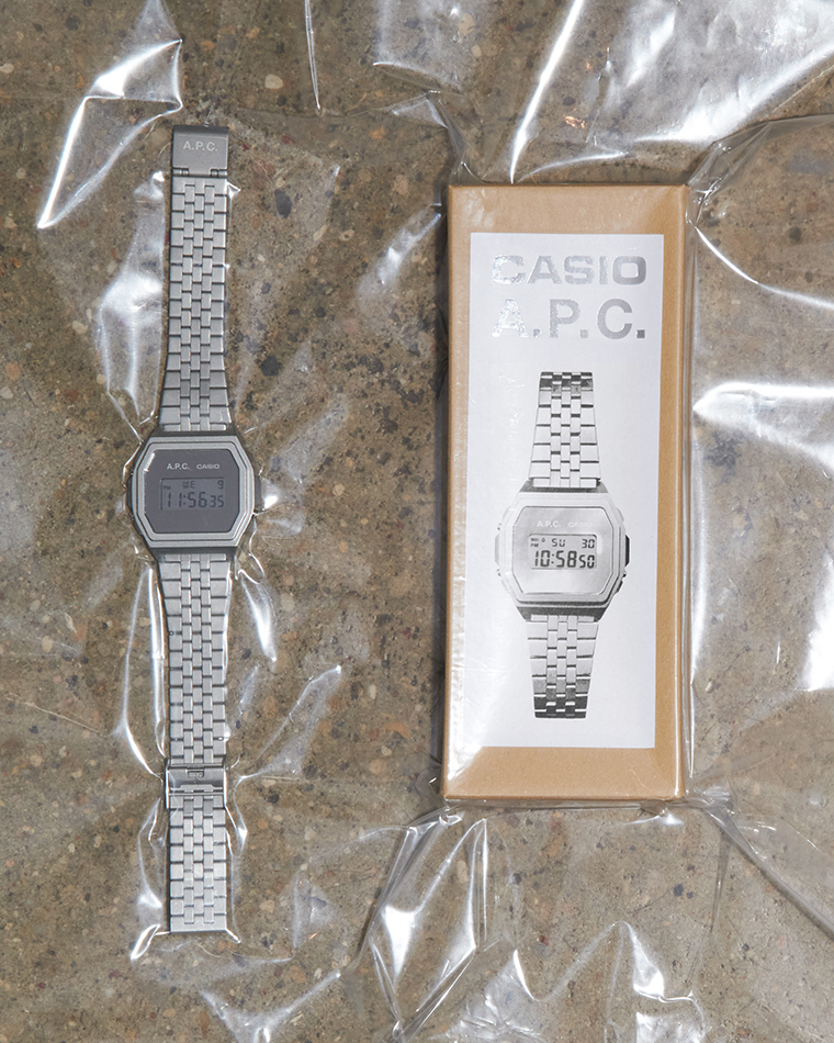 CASIO จับมือ A.P.C. ออกนาฬิการุ่นพิเศษที่ผสมผสานกลิ่นอายของแบรนด์แฟชั่นฝรั่งเศสเข้ากับรุ่น A1000 อันมีเอกลักษณ์ซึ่งเป็นนาฬิกา unisex ที่มีฟังก์ชันหลากหลาย อาทิ นาฬิกาปลุก จับเวลา และไฟ LED มาพร้อมเส้นสายสไตล์วินเทจเปรียบเสมือนไทม์แมชชีน ที่ให้ความสุนทรีแบบวินเทจชวนให้นึกถึงยุค 1970 นาฬิการุ่นนี้มาพร้อมทรงและหน้าปัดเพรียวบาง ตัวเรือนแปดเหลี่ยม และมีหน้าจอ LCD ตรงกลางหน้าปัด ซึ่งมีโลโก้ Casio และ A.P.C. มาในสองสี สีเงินและสีทอง ซึ่งทั้งสองเวอร์ชันนี้นำเสนอความหรูหราที่มาพร้อมเอฟเฟกต์กระจกบนหน้าปัดแวววาว ด้านสายนาฬิกาเหล็กนั้นออกแบบให้ปรับได้ง่ายเพื่อความเรียบง่ายยิ่งขึ้น โหมดสำหรับแต่ละปุ่มจะถูกสลักไว้ที่ด้านหลังตัวเรือน พร้อมโลโก้ A.P.C. รูปกีต้าร์