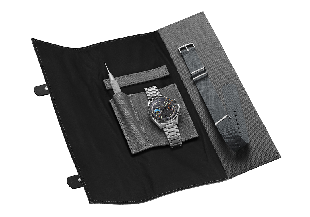 นาฬิกาสามารถเลือกสวมใส่ได้ทั้งแบบสายนาฬิกาโลหะสแตนเลสสตีลที่มาพร้อมกับระบบปรับสายอันสะดวกสบายซึ่งเป็นสิทธิบัตรของ OMEGA หรืออีกทางเลือกอย่างสายนาฬิกาสำรองอย่างสาย NATO สีเทาที่บรรจุอยู่ด้านในกระเป๋านาฬิกาสำหรับเดินทาง สายนาฬิกาชนิดนี้ได้รับการเสริมความแข็งแรงด้วยเส้นด้าย KEVLAR® และมาพร้อมกับหัวสายที่ผลิตจากสแตนเลสสตีลขัดด้าน