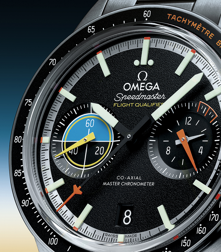 บางทีรายละเอียดที่สะกดสายตามากที่สุดคือหน้าปัดย่อยคู่ซึ่งมีพื้นผิวตรงกลางเป็นสีโอพาลีนและขอบด้านนอกมีการขัดลบมุมอย่างประณีต ณ ตำแหน่ง 3 นาฬิกา OMEGA ได้ติดตั้งหน้าปัดจับเวลา 60 นาทีและ 12 ชั่วโมงพร้อมเข็มสีส้มสามเหลี่ยมขัดด้านและพิมพ์ตัวเลขด้วยสีขาว หน้าปัดย่อยได้ถูกออกแบบให้ดูเหมือนหน้าปัด “แสดงการใช้เชื้อเพลิง” ในห้องนักบิน