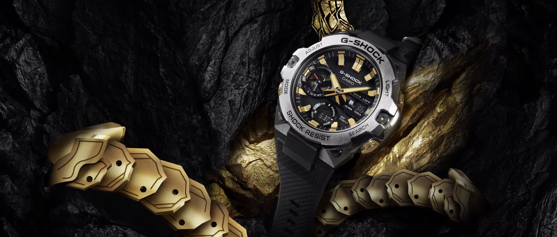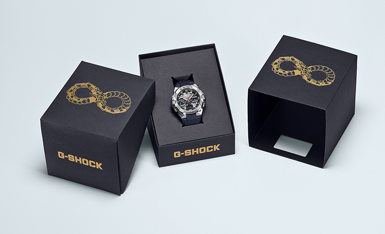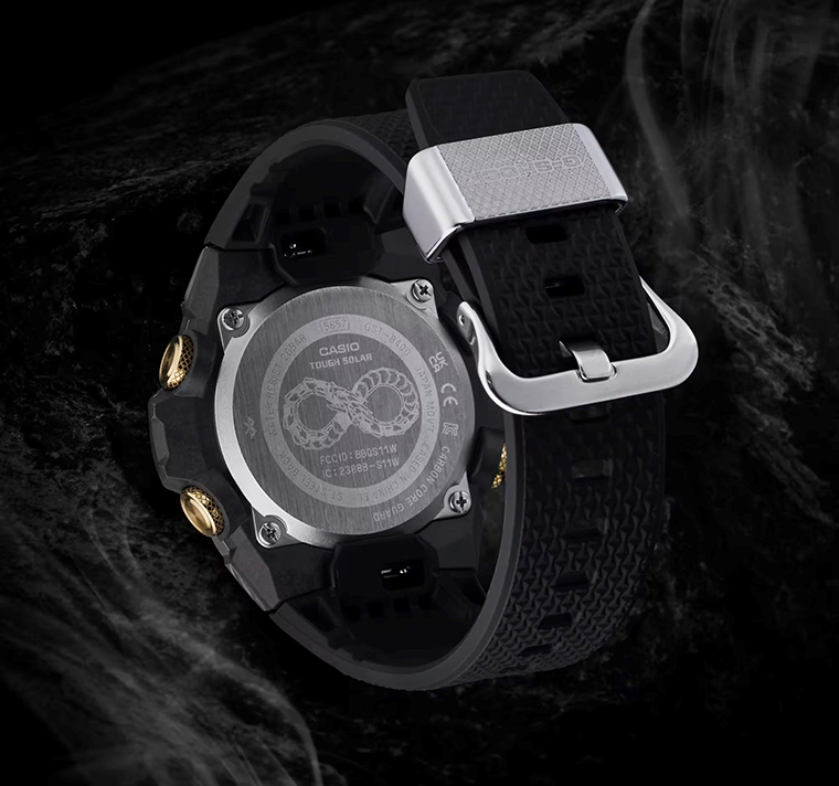 นาฬิการุ่น GST-B400CX ลิมิเต็ด อิดิชั่น เรือนนี้เป็นหนึ่งในผลงานจากซีรีส์ G-STEEL ที่ผสมผสานระหว่างวัสดุโลหะและ เรซินเข้าไว้ด้วยกัน เพื่อเป็นการเฉลิมฉลองปีงูด้วยการถ่ายทอดแก่นแท้ของสัญลักษณ์อันเก่าแก่เสริมด้วยความทันสมัย โดยนาฬิกาเรือนนี้มีพื้นฐานมาจากรูปทรงอันเพรียวบางของรุ่น GST-B400 และเสริมด้วยลวดลายงูอูโรโบรอส ซึ่งเป็นสัญลักษณ์งูกินหาง ตัวแทนของความไม่สิ้นสุดและความเป็นนิรันด์ ซึ่งทั้งสองอย่างนี้ถือเป็นสัญลักษณ์แห่งความโชคดี พร้อมประดับด้วยกรอบโลหะสีเงิน หน้าปัดสีดำเงา และรายละเอียดสีทองอันโดดเด่น มอบความสง่างามที่เหมาะสำหรับหลากหลายโอกาสทั้งทางการและลำลอง