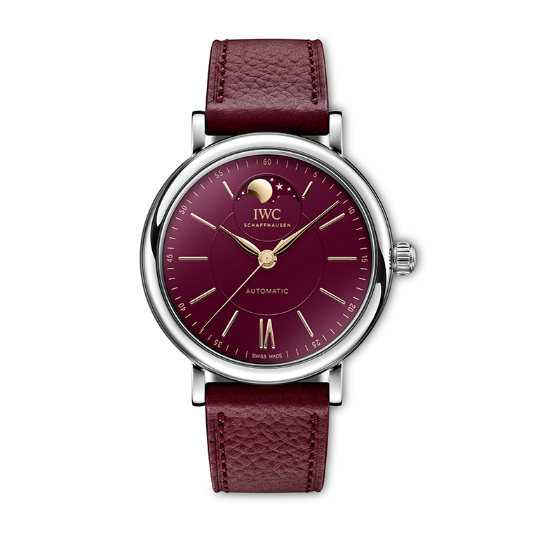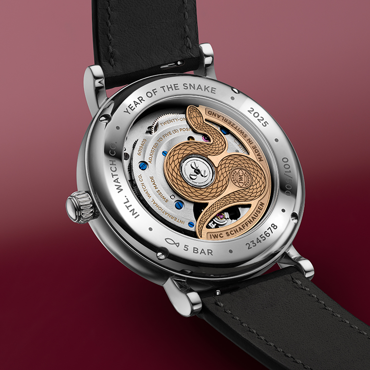 สำหรับปีนักษัตรมะเส็ง หรืองูเล็ก จะเริ่มต้นศักราชตั้งแต่วันที่ 29 มกราคม ปี 2025 จนกระทั่งสิ้นสุดในวันที่ 16 กุมภาพันธ์ ปี 2026 ซึ่ง IWC Schaffhausen เฉลิมฉลองการมาถึงของนักษัตรนี้ด้วย Portofino Automatic Moon Phase 37 Year of the Snake หมายเลขรหัส IW459604 โดยสะท้อนภาพลักษณ์ที่แตกต่างไปจาก 3 รุ่นก่อนหน้าที่มีตัวเรือนใหญ่และสปอร์ต แต่รุ่นนี้เผยโฉมหน้ามาในตัวเรือนขนาด 37.1 มิลลิเมตร อันเป็นขนาดที่จัดอยู่ในกลุ่มบอยไซส์หรือยูนิเซ็กส์ สามารถสวมใส่เหมาะสมทั้งข้อมือผู้ชายและผู้หญิง ตัวเรือนสร้างสรรค์จากสเตนเลสสตีลสะท้อนความหรูหราคลาสสิกจากการขัดจนแวววาวทั้งเรือน และมีความหนา 11.3 มิลลิเมตร เม็ดมะยมแกะสลักเป็นร่องให้ง่ายต่อการจับหมุน กันน้ำได้ 50 เมตร ขณะที่หน้าปัดยังคงใช้สีแดงเบอร์กันดีแบบปีนักษัตรก่อนๆ เพื่อแสดงถึงความโชคดีและความเป็นศิริมงคลตามความเชื่อของคนจีน และยังสื่อถึงการเฉลิมฉลองเทศกาลตรุษจีนหรือปีใหม่จีนอีกด้วย โดยมีพื้นผิวที่ผ่านการเคลือบเงาเพิ่มความโดดเด่น และมีเลย์เอาท์เหมือนกับ Portofino Automatic Moon Phase 37 ทุกอย่าง องค์ประกอบต่างๆ บนหน้าปัดทั้งมาร์คเกอร์ เข็ม มาตรเวลา และข้อความต่างๆ ล้วนถูกชุบด้วยสีทองอันเป็นสีแห่งโชคลาภและความมั่งมีศรีสุขของชาวจีน มีการแสดงเวลาเป็นชั่วโมง นาที วินาที และมีวงหน้าปัดเล็กทางด้านบนที่มีสีเดียวกัน สำหรับบอกข้างขึ้นข้างแรมด้วยแผ่นดิสก์สีแดงตกแต่งรูปพระจันทร์และกลุ่มดาวสีทองในช่องเปิดโค้ง ซึ่งสามารถคำนวณดิถีของพระจันทร์ได้อย่างแม่นยำโดยจะคลาดเคลื่อนเพียงหนึ่งวันจากวิถีโคจรจริงของดวงจันทร์หลังจากผ่านไป 122 ปี