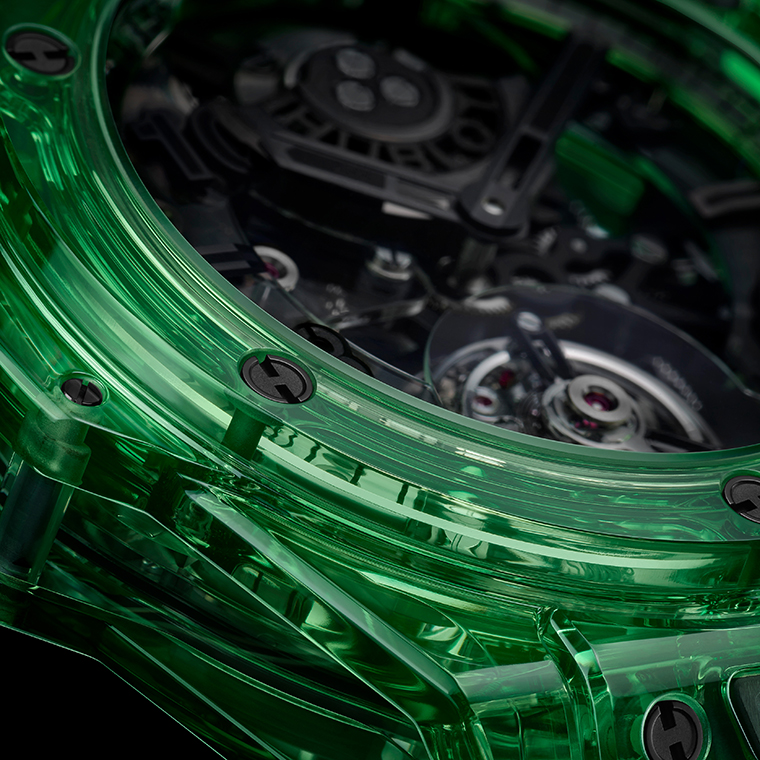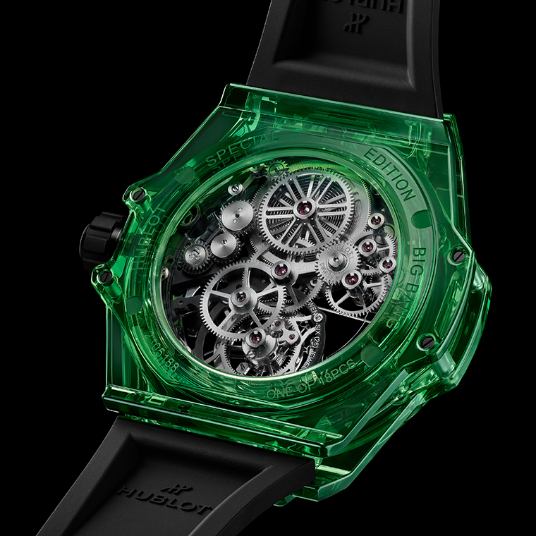 Hublot (อูโบลท์) ผู้นำทางด้านนวัตกรรมวัสดุศาสตร์อันล้ำสมัย กับห้องปฏิบัติการทางด้านวัสดุและโลหะวิทยาของตัวเองที่มีความเชี่ยวชาญในการผลิตวัสดุโปร่งใส เช่น คริสตัล แซฟไฟร์ มีความมุ่งมั่นในการค้นคว้าหาความคิดสร้างสรรค์ใหม่ๆ อยู่เสมอ Hublot จึงถือเป็นนาฬิกาแบรนด์แรกและแบรนด์เดียวที่ใช้วัสดุ SAXEM ซึ่งมีความคล้ายคลึงกับแซฟไฟร์แต่มีคุณสมบัติที่ให้ความสว่างมากกว่าและมีความเป็นไปได้ทางด้านสีสันที่หลากหลาย ครั้งนี้ทางแบรนด์จึงได้นำเสนอนาฬิกา Big Bang Tourbillon Automatic Green SAXEM (บิ๊ก แบง ทูร์บิญอง ออโตเมติก กรีน ซาเซ็ม) ซึ่งผสมผสานตัวเรือนโปร่งใสสีเขียวมรกตเข้ากับกลไกทูร์บิญองไขลานอัตโนมัติ โดยผลิตในจำนวนจำกัดเพียง 18 เรือนเท่านั้น