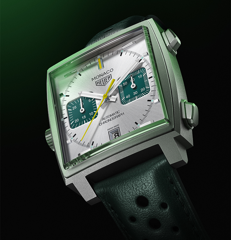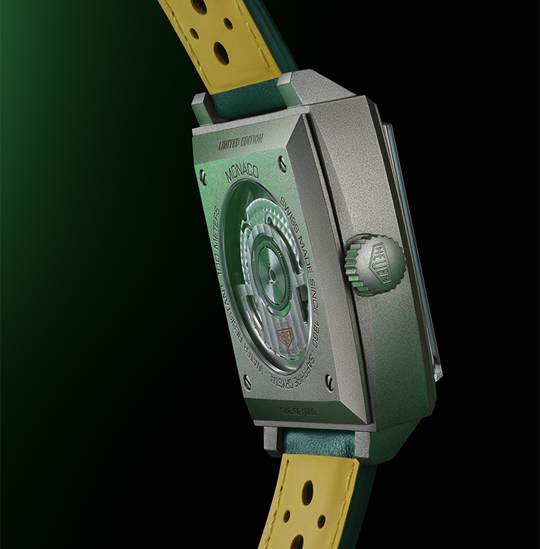นาฬิการุ่นนี้มาพร้อมสายนาฬิกาหนังสีเขียวแบบเจาะรู เพิ่มความโฉบเฉี่ยวอย่างมีระดับ ขับเคลื่อนด้วยกลไกอัตโนมัติ Calibre 11 อันล้ำสมัย และเม็ดมะยมด้านซ้ายซึ่งเป็นเอกลักษณ์ของตระกูล Monaco ผลิตจำนวนจำกัดเพียง 1,000 เรือนเท่านั้น เพื่อตอบโจทย์ผู้ที่หลงใหลในจิตวิญญาณแห่งความเร็วและดีไซน์เหนือกาลเวลา
