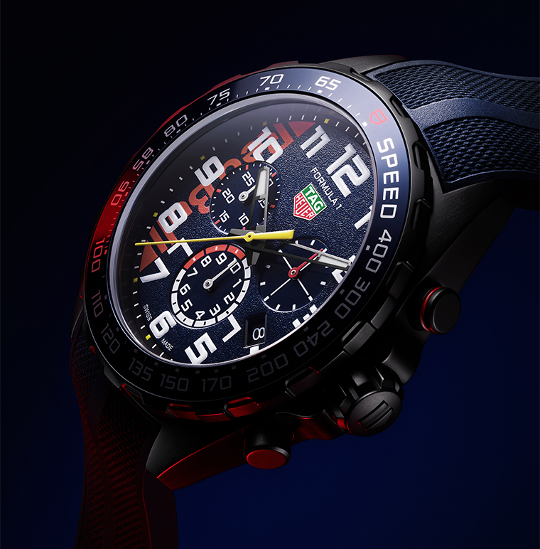 เริ่มต้นด้วยนาฬิการุ่นใหม่ล่าสุดจากคอลเลกชัน Formula 1 นาฬิกาสปอร์ตที่สะท้อนความตื่นเต้นเร้าใจของการแข่งขัน Formula 1 กับ TAG Heuer Formula 1 Chronograph x Oracle Red Bull Racing รุ่นลิมิเต็ด เอดิชัน ที่เฉลิมฉลองครบรอบ 20 ปีของทีม Oracle Red Bull Racing ในโลกแห่งการแข่งขัน ตัวเรือนสตีลเคลือบ DLC สีดำขนาด 43 มม. มาพร้อมหน้าปัดสีน้ำเงินลายเกรน รายละเอียดที่หน้าปัดย่อย ช่วงตัวเลข 7 ถึง 10 เป็นสีแดง สื่อถึงความเร็วสูงในการแข่งขัน ที่สะท้อนเอกลักษณ์ของ Red Bull ได้อย่างลงตัว