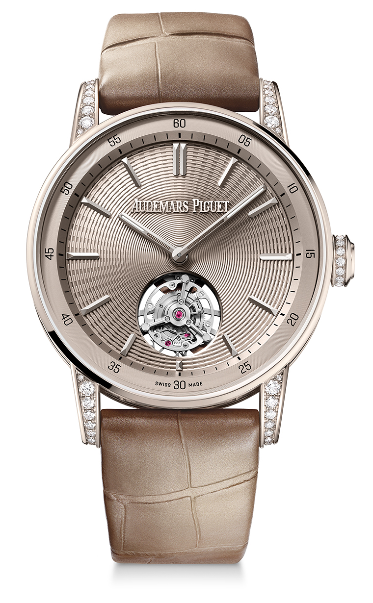 นาฬิการุ่น Code 11.59 by Audemars Piguet Flying Tourbillon ขนาดหน้าปัด 38 มิลลิเมตรใหม่เรือนนี้มาพร้อมรูปลักษณ์อันหรูหราของตัวเรือนแซนด์โกลด์ 18 กะรัต ประดับด้วยเพชรเจียระไนแบบ brilliant cut หน้าปัดโทนสีแซนด์โกลด์ และสายหนังจระเข้สีเบจ © ภาพลิขสิทธิ์จาก Audemars Piguet