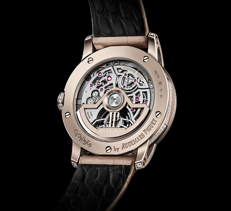 เพชรเจียระไนแบบ brilliant cut จำนวน 235 เม็ด (น้ำหนักรวม 1.2 กะรัต) ถูกนำมาประดับไว้บนตัวเรือนส่วนกลาง ขานาฬิกา และเม็ดมะยม ช่วยเพิ่มความสง่างามสุดระยิบระยับให้กับนาฬิกา เพชรแต่ละเม็ดได้รับการคัดสรรมาอย่างพิถีพิถันเพื่อให้ตรงตามหลักเกณฑ์ที่เข้มงวดที่สุดของ Audemars Piguet ทั้งในเรื่องความบริสุทธิ์และสีสัน ก่อนที่จะเจียระไนเป็นขนาดต่าง ๆ เพื่อให้เข้ากับเส้นสายและรูปทรงที่แตกต่างกันของตัวเรือน คุณภาพของการเจียระไนมีความสำคัญพอ ๆ กับคุณภาพตามธรรมชาติของเพชร เพื่อให้เพชรสามารถเปล่งประกายระยิบระยับได้อย่างไม่มีที่สิ้นสุด ในขณะที่การจัดวางให้ลงตัวเป็นกุญแจสำคัญในการสร้างองค์ประกอบของการประดับเพชรที่งดงามและกลมกลืน