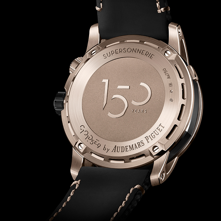 มุมมองทางด้านหลังที่มองเห็นโลโก้ฉลองครบรอบ 150 ปีสลักอยู่บนฝาหลัง © ภาพลิขสิทธิ์จาก Audemars Piguet