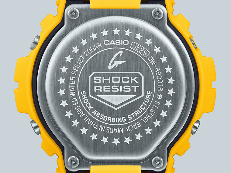 โลโก้ 'SHOCK RESIST' หลังตัวเรือน ล้อมรอบด้วยดาว 30 ดวงเพื่อเฉลิมฉลองครบรอบ 30 ปีของรุ่น 6900