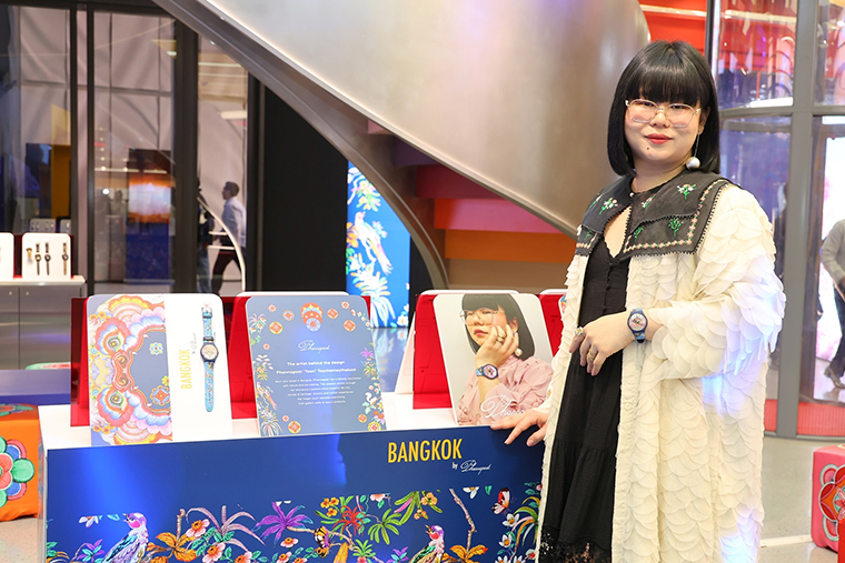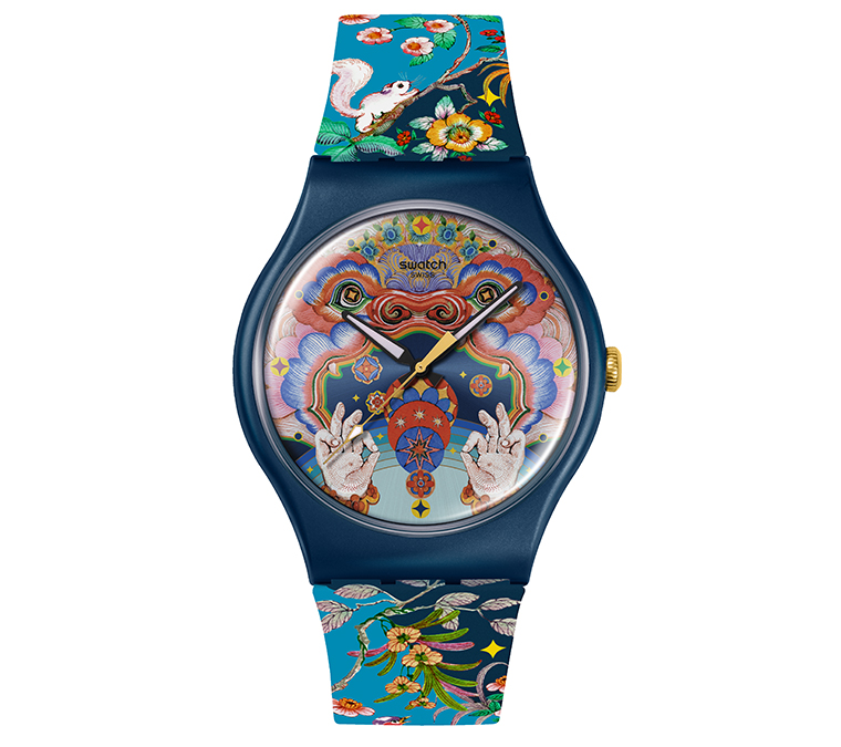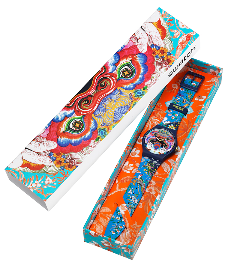 และเพื่อเป็นการเฉลิมฉลองร้านสาขาใหญ่ที่สุดในโลก ในกรุงเทพมหานคร อีกหนึ่งไฮไลท์ของงานคือการเปิดตัวนาฬิกา Swatch Destination Art Bangkok รุ่น THE WANDERER ซึ่งออกแบบโดยไทยดีไซเนอร์ ยูน-ปัณพัท เตชเมธากุล ด้วยแรงบันดาลใจจาก ‘หนุมาน’ ตัวละครเอกจากเรื่องรามเกียรติ์ ไปจนถึงลายไทยอันวิจิตรบรรจง และยังได้แรงบันดาลใจจากความนิยมในการพกเครื่องรางของสังคมไทย โดยหนุมานนั้นขึ้นชื่อว่ามีอำนาจในการคุ้มครอง ทั้งยังจงรักภักดีไม่มีสั่นคลอน ซึ่งเป็นหัวใจการออกแบบของผลงานชิ้นนี้ นอกจากงานศิลป์ลวดลายดาวและเดือน จากลายไทยประจำยามอันงดงามชวนฝันแล้ว นาฬิกาสีสันสดใสเรือนนี้จะทำหน้าเป็นเครื่องรางที่คอยปัดเป่าพลังงานลบอีกด้วย นาฬิการุ่นนี้จะเป็นสื่อกลางชวนคิดถึงมรดกทางวัฒนธรรมอันงดงามของไทย เชิดชูความมีชีวิตชีวาและความสนุกสนานของเมืองหลวงของไทย