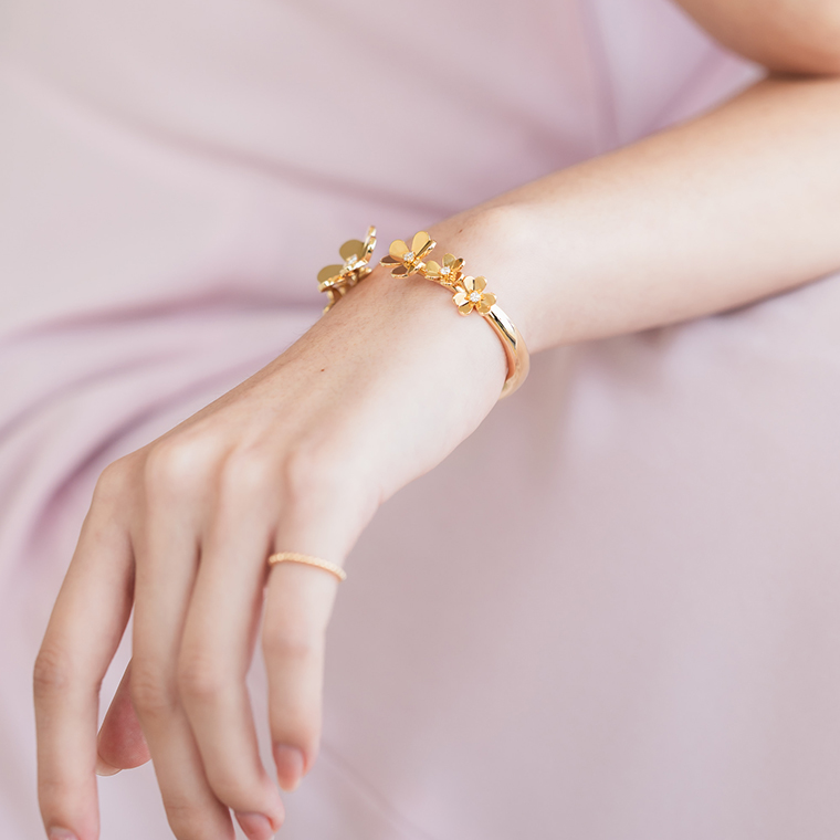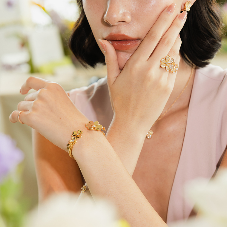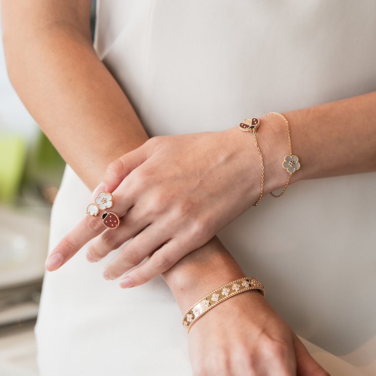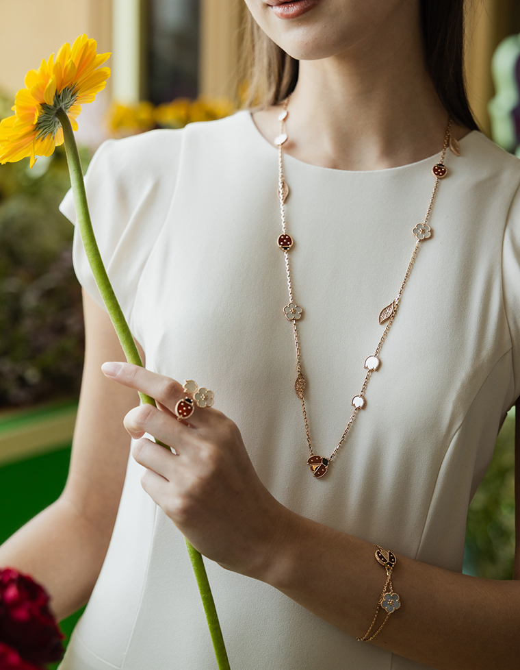 คอลเลกชันเครื่องประดับ Lucky Spring หรือ “ฤดูใบไม้ผลินำโชค” ได้เริ่มจารึกเรื่องราวของตนขึ้นเมื่อปี 2021 ในฐานะบทสรุปอาณาจักรจินตนาการ และมุมมองสดใสของเมซงที่มีต่อการดำเนินชีวิต สำหรับปีนี้ สวนธรรมชาติในฝันของ Van Cleef & Arpels ได้ต้อนรับสมาชิกใหม่ ซึ่งหลอมรวมสองแนวทางการออกแบบอันเป็นที่รักของเมซงเข้าด้วยกัน นั่นก็คือธรรมชาติ และสัญลักษณ์นำโชค โดยอาศัยประกายเจิดจรัสของบรรดาวัสดุเลอค่า ไม่ว่าจะเป็นทองคำสีกุหลาบ, แผ่นแม่มุกหรือมาเธอร์-ออฟ-เพิร์ลสีขาว, นิลกาฬหรือออนิกซ์ และโมราสีเพลิง หรือคาร์เนเลียน เครื่องประดับแต่ละชิ้นคือการนำโมทิฟรูปทรงอ่อนช้อยแบบต่างๆ มาเรียงร้อยเข้าด้วยกันเพื่อจุดประกายจินตนาการถึงทิวทัศน์ชนบทธรรมชาติท่ามกลางประกายระยิบระยับสะกดสายตา จากดอกตูมของลิลลี ออฟ เธอะ วัลเลย์ ไปจนถึงแมลงเต่าทอง และดอกเหมย ล้วนถูกรังสรรค์ขึ้นอย่างเรียบง่าย กระนั้น กลับสะท้อนถึงความบริสุทธิ์สดใสในธรรมชาติได้อย่างงามสง่า งานออกแบบแต่ละชิ้น เป็นเสมือนหลักฐานยืนยันถึงความประณีต พิถีพิถัน และอดทนเป็นอย่างยิ่งระหว่างดำเนินกระบวนการสร้างสรรค์เพื่อเป็นเครื่องประดับนำโชค และความสุขมาสู่ผู้ได้ครอบครอง และสวมใส่อย่างแท้จริง