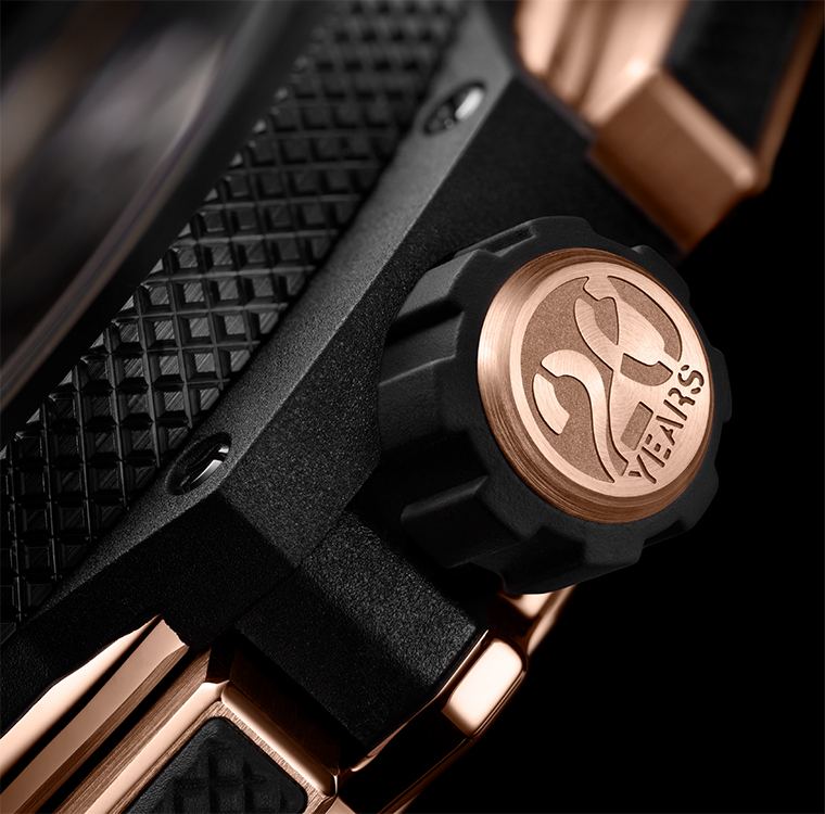 กลับสู่จุดเริ่มต้น การผสมผสานครั้งแรก เมื่อ Big Bang เผยโฉมในปี 2005 เริ่มต้นด้วยสองรุ่นที่ได้กำหนดทิศทางของคอลเลกชั่นตามปรัชญา "Art of fusion" ซึ่งทำให้ Hublot และ Big Bang ได้รับการยอมรับจากทั่วโลก การผสมผสานระหว่างสเตนเลสสตีลหรือทอง, ไฟเบอร์กลาส, ยาง และเซรามิก พร้อมหน้าปัดลวดลายที่สะท้อนถึงรูปลักษณ์ของคาร์บอนไฟเบอร์ที่ทอเป็นลาย และมีสีแดงเล็กน้อยที่เป็นเอกลักษณ์ นั่นคือสิ่งที่ทำให้ภาพลักษณ์สามารถจดจำได้ในทันที สำหรับรุ่นครบรอบ 20 ปีของ Big Bang ซึ่งผลิตจำกัดจำนวนเพียง 500 เรือนในตัวเรือนเซรามิกไทเทเนียมและ 250 เรือนในเซรามิกคิงโกลด์ ทาง Hublot ได้ทำการปรับแต่งทุกรายละเอียดอย่างพิถีพิถัน ตัวเรือนใหม่มีขนาดเส้นผ่านศูนย์กลางที่ 43 มม. พร้อมตัวเชื่อมสายที่โค้งเล็กน้อย ขอบตัวเรือนนาฬิกามีการขัดเงา ซึ่งเป็นการนำลักษณะเด่นของ Big Bang รุ่นแรกกลับมา นอกจากนี้ยังเป็นการกลับมาของปุ่มกดสี่เหลี่ยมที่หุ้มปลายยางที่พบในรุ่นแรกๆ ของ Big Bang พร้อมด้วยสายยางลายข้าวหลามตัดที่สามารถเปลี่ยนสายได้ง่ายด้วยระบบ One-Click ที่ติดตั้งในตัวเรือน