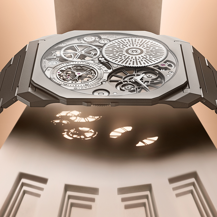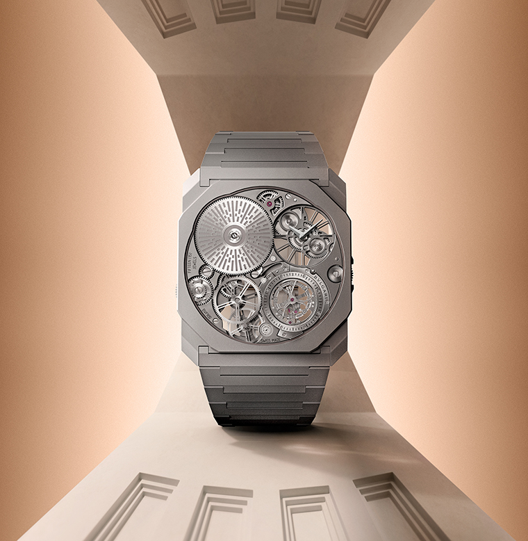 ออคโต ฟินิสซิโม อัลตรา ทูร์บิญอง เหนือกว่าเดิมด้วยการสร้างสถิติความบางใหม่ ด้วยการหลอมรวมโครงสร้างทูร์บิญองเข้ากับกลไกของนาฬิกาที่มีความหนาเพียง 1.85 มม. ผ่านวิธีการผลิตนาฬิกาแบบสวิสโดยช่างอัญมณีโรมัน แสดงให้เห็นถึงความเชี่ยวชาญด้านนาฬิกาด้วยวิธีการประดิษฐ์นาฬิกาอันเป็นเอกลักษณ์ที่ซับซ้อนทื่สุด