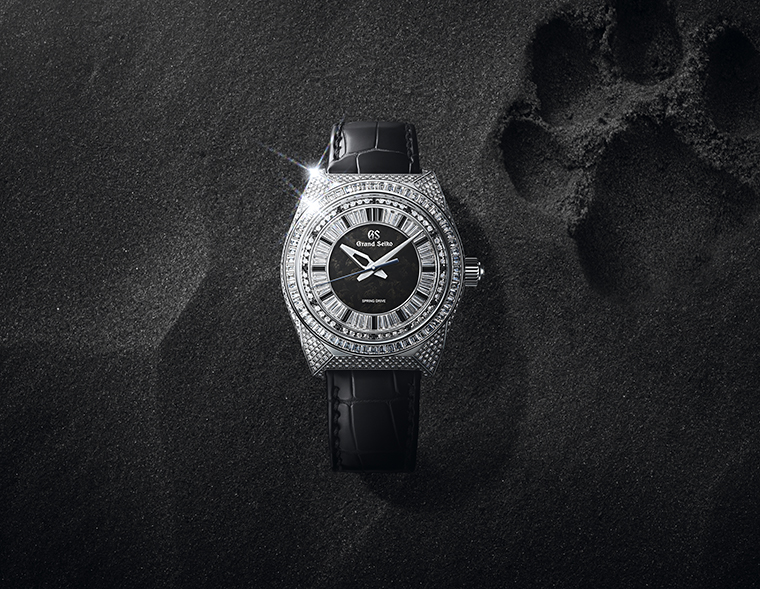 แรงบันดาลใจของนาฬิการุ่นนี้ คือ ลักษณะของสิงโตที่แสดงตนออกจากความมืดมิด โดยถ่ายทอดผ่าน เพชรกว่า 600 เม็ดที่ประดับอยู่บนตัวเรือน หน้าปัด วงขอบหน้าปัด และเม็ดมะยม เพื่อสร้างสรรค์ รูปลักษณ์ที่ทรงพลังและน่าเกรงขาม ตัวเรือนฝังเพชรแบบพาเวเต็มพื้นที่ ก่อให้เกิดความแวววาวที่เปล่ง ประกายจากสันนูนของตัวเรือน ช่วยเน้นย้ํารูปทรงอันวิจิตรงดงามของตัวเรือน อีกทั้งความแวววาวนี้ยัง ได้รับการเสริมแต่งเพิ่มเติมด้วยการประดับเพชรไว้เคียงข้างกับเหล่าสปิเนลสีดําา เพื่อสะท้อนแนวคิดเกี่ยวกับแสงและเงาที่มีความสําคัญยิ่งต่อดีไชน์ของ Grand Seiko ออกมาอย่างโดดเด่น