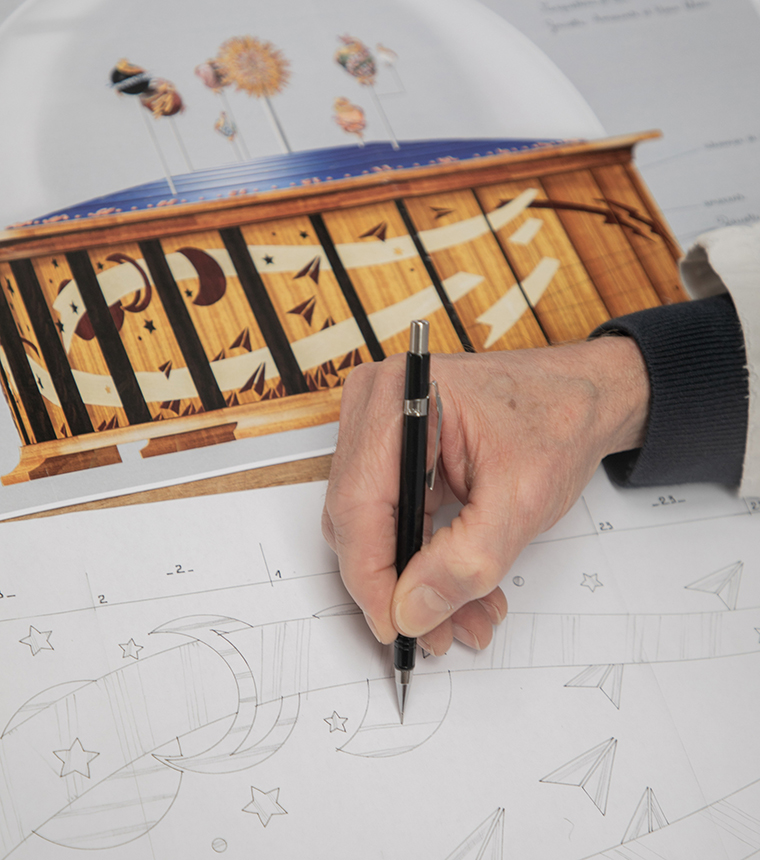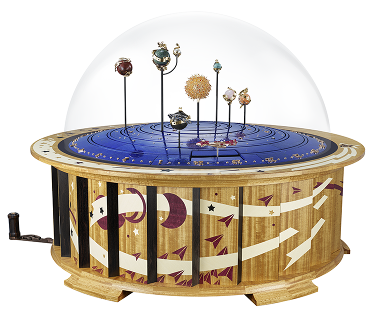 เพื่อรังสรรค์มิติล้ำลึกของห้วงจักรวาล ต้องอาศัยแผ่นพลอยน้ำสมุทรลาพิซ ลาซูลิบางเฉียบ เรียงซ้อนสิบห้าวงรองรับงานประดับดาวทองคำสีกุหลาบกับทองคำสีขาว และงานฝังเพชรหุ้มต่างเกล็ดละอองเทหวัตถุกระจายตัวไปตามแนววิถีโคจรของดาวเคราะห์บริวาร ในขณะที่เหล่าดาวเคราะห์ และดาวตกเคลื่อนตัวตามวิถีโคจรจริงของตนเองท่ามกลางเวิ้งจักรวาลระยับแสง ความงดงามตระการตานำมาซึ่งสองอารมณ์ชวนฝัน ระหว่างความน่าเกรงขามทางปรากฏการณ์ธรรมชาติในระบบสุริยะ กับความเป็นเลิศเหนือจินตนาการทางเทคนิคงานฝีมือ