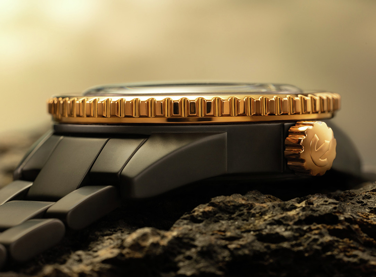 หลังจากที่ Rado เปิดตัว Captain Cook ไปครั้งแรกตั้งแต่ปี ค.ศ.1962 และประสบความสำเร็จอย่างรวดเร็ว แบรนด์ได้ต่อยอดความสำเร็จนั้นด้วยการเนรมิตวัสดุสุดล้ำอย่างไฮเทคเซรามิกในเฉดสีใหม่มาเรื่อยๆ ซึ่ง Captain Cook High-Tech Ceramic Skeleton เรือนล่าสุดนี้ใช้ไฮเทคเซรามิกแบบ โมโนบล็อกสีดำด้านดูเข้มแข็ง อบอุ่น ตัดกับขอบหน้าปัดหมุนได้สีโรสโกลด์ ซึ่งบริเวณขอบหน้าปัดนี้เองที่แบรนด์เติมรอยหยักให้ดูคมชัดขึ้น เพื่อเพิ่มความสปอร์ตและทะมัดทะแมงยามสวมใส่ ถัดเข้ามาตรงใจกลางนาฬิกาเผยให้เห็นหน้าปัดรมควันด้านในที่ดูมีเสน่ห์กับกลไกการเดินคาลิเบอร์ออโตเมติก R808 ซึ่งรังสรรค์ขึ้นเป็นลวดลายแบบ Côtes-de-Genève อันประณีตบรรจง ส่วนรายละเอียดบนหน้าปัดนั้น ทั้งขีดบอกเวลา ตัวเลข และเข็มนาฬิกาเป็นสีโรสโกลด์เคลือบสาร Super-LumiNova® สีดำพิเศษไว้ ซึ่งจะเรืองแสงสีฟ้าราวกับหลุดมาจากอวกาศ ให้เรามองเห็นเวลาได้อย่างชัดเจนไม่ว่าแสงรอบตัวจะน้อยเพียงใดก็ตาม เมื่อพลิกนาฬิกาไปด้านหลังก็จะพบฝาหลังไทเทเนียมชุบ PVD สีดำ กับคริสตัลแซฟไฟร์ที่เปิดให้เราเห็นกลไกการเดินจากอีกมุมหนึ่งด้วย ตัวสายนาฬิกาทำจากไฮเทคเซรามิกสีดำด้าน มอบความรู้สึกสบายผิวอันเป็นจุดเด่นที่ทำให้คนรักนาฬิกาหลงใหลวัสดุชนิดนี้