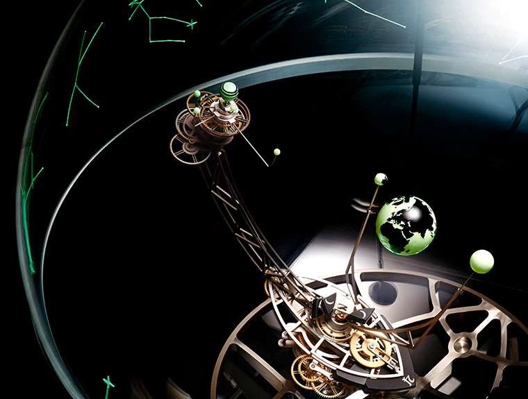 จึงได้นำโลกมาไว้ที่จุดศูนย์กลางของจักรวาลทรงกลม และให้วัตถุท้องฟ้าอื่น ๆ โคจรรอบโลก นาฬิกาเรือนนี้จะแสดงการโคจรของดวงอาทิตย์ ดวงจันทร์ ดาวพฤหัสบดี รวมถึงดวงจันทร์บริวารทั้งสี่ของดาวพฤหัสบดี กลไกการโคจรขับเคลื่อนด้วยระบบขึ้นลานด้วยมือ พร้อมระบบปฏิทินถาวรที่แสดงผลแนวระนาบ ซึ่งควบคุมการเคลื่อนไหวของวัตถุท้องฟ้าแบบเรียลไทม์ กลไกนี้ประกอบด้วยกระปุกลานแปดตัวที่ทำงานด้วยความถี่ 18,000 ครั้งต่อชั่วโมง แต่ละกระปุกลานติดตั้งสปริงที่มีความยาว 4 เมตร รวมความยาวทั้งหมดเป็น 32 เมตร ซึ่งสปริงเป็นส่วนสำคัญในการขับเคลื่อนระบบพลังงานสำรองที่สามารถทำงานได้ยาวนานถึง 40 วัน ส่งพลังงานต่อเนื่องเพื่อให้กลไกอันซับซ้อนของนาฬิกาทำงานได้อย่างเปี่ยมประสิทธิภาพ