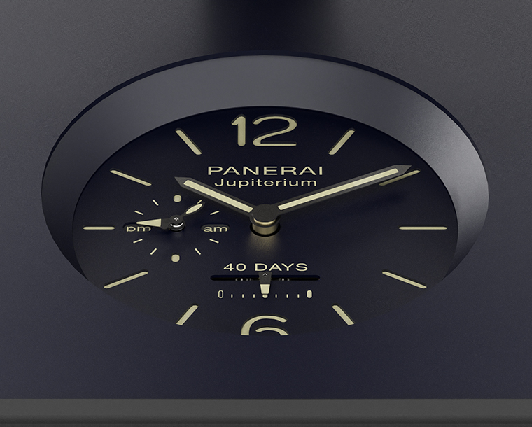 Jupiterium บรรจุภายในกล่องกระจก บนฐานไม้มะฮอกกานี ขนาด 75 x 86 ซม. และมีน้ำหนักประมาณ 110 กิโลกรัม หน้าปัดหลักของนาฬิกาอยู่บริเวณด้านล่างของจักรวาลทรงกลมโดยพื้นหน้าปัดสีดำตกแต่งด้วยหลักชั่วโมงแบบแท่ง และตัวเลขอารบิกเรืองแสงขนาดใหญ่ ที่ตำแหน่ง 12 และ 6 นาฬิกา เพื่อให้สามารถอ่านค่าได้ง่ายแม้ในสภาวะแสงน้อย เข็มชั่วโมง นาที และวินาทีเคลือบสารเรืองแสง Super-LumiNova® เพิ่มประสิทธิภาพในการอ่านค่าในความมืด นอกจากนี้ ยังมีฟังก์ชันแสดงค่าสำคัญ เช่น แสดงค่า AM/PM และมาตรแสดงพลังงานสำรองแบบเส้นตรง พร้อมสลักคำว่า ‘40 giorni’ (40 วัน) บริเวณขอบหน้าปัดแกะสลักชื่อ ‘Jupiterium’ ขณะที่กลไกของนาฬิกาสลักเป็นภาษาอิตาเลียนว่า ‘Calendario Perpetuo’ ซึ่งหมายถึงปฏิทินถาวร โดยแสดง วัน วันที่ เดือน และปี ในรูปแบบการแสดงผลแบบเรียงเป็นระนาบตรง