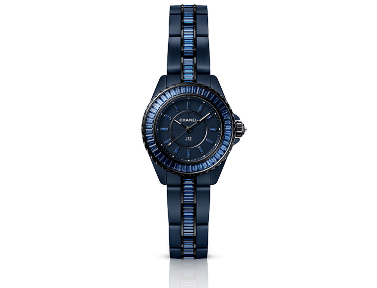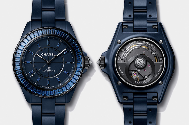 สตูดิโอสร้างสรรค์นาฬิกาของชาเนลได้จินตนาการถึงคู่หูนาฬิกาที่เป็นการผสมผสานขั้วตรงข้ามอย่างลงตัวและนำเสนอผ่านนาฬิกา J12 ในสองขนาด นั่นคือ 42 มม. และ 28 มม. คู่ Mini & Maxi สุดพิเศษนี้เปล่งประกายด้วยแซฟไฟร์สีนํ้าเงินที่ประดับอยู่บนขอบตัวเรือน หน้าปัด และสายรัดข้อมือ อัญมณีธรรมชาติสีนํ้าเงินสดใสตัดกับเฉดสีน้ำเงินด้านของเซรามิกจากชาเนลได้อย่างลงตัว พร้อมมอบประกายเจิดจรัสอย่างไร้ที่สิ้นสุด CHANEL Manufacture ใช้เวลากว่า 110 ชั่วโมงในการฝังอัญมณีลงบนตัวเรือนของนาฬิกา J12 ทั้งสองขนาด โดยขนาด 42 มม. ตกแต่งด้วยแซฟไฟร์เจียระไนทรงบาแก็ตต์ 170 เม็ด ขณะที่ขนาด 28 มม. ตกแต่งด้วยแซฟไฟร์เจียระไนทรงบาแก็ตต์ 196 เม็ด ขอบตัวเรือนและเม็ดมะยมสตีลเคลือบสีดำช่วยเพิ่มความลุ่มลึกให้กับสีนํ้าเงินของเซรามิกและเพิ่มมิติของคอนทราสต์ให้โดดเด่นยิ่งขึ้น