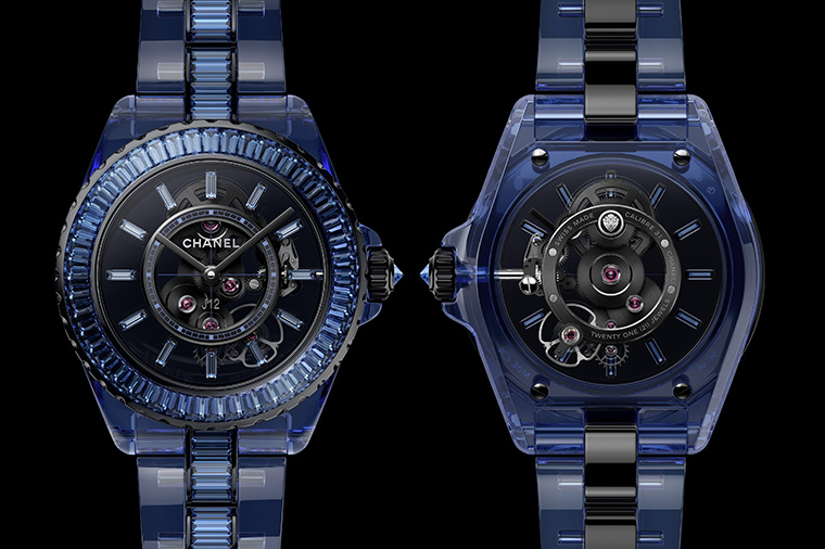 J12 BLEU X-RAY ยกย่องความโปร่งใสด้วยเฉดสีน้ำเงินใหม่ประจำคอลเลคชั่นนี้ ซึ่งได้รับแรงบันดาลใจมาจากสีของท้องฟ้าและท้องทะเลในวันที่อากาศแจ่มใส ตัวเรือนและสายรัดข้อมือแกะสลักจากบล็อกแซฟไฟร์สังเคราะห์เพียงชิ้นเดียวซึ่งต้องใช้เวลากว่า 1,600 ชั่วโมง ขอบตัวเรือนและข้อต่อรังสรรค์จากไวท์โกลด์และประดับด้วยแซฟไฟร์ธรรมชาติสีน้ำเงินสดใสที่เจียระไนทรงบาแก็ตต์จำนวน 196 เม็ด และเพื่อเติมเต็มความงามในทุกรายละเอียด สตูดิโอสร้างสรรค์ยังผสานไวท์โกลด์เข้ากับสีดำเพื่อสร้างคอนทราสต์ที่สง่างามให้กับบทประสานที่ลงตัวของเฉดสีน้ำเงิน