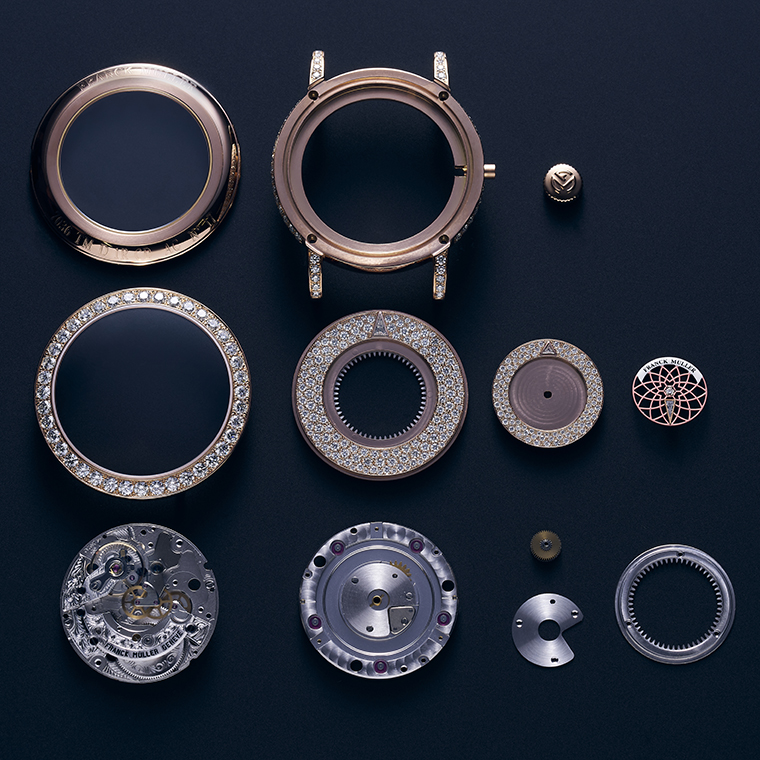 หลังจากการวิจัยและทดสอบด้วยวัสดุหลากชนิดหลายต่อหลายครั้ง นักประดิษฐ์ของ แฟรงค์ มุลเลอร์ พบว่าอะลูมิเนียมเป็นตัวเลือกที่ดีที่สุดสำหรับจานวินาที เพราะให้ความสมดุลอย่างเหมาะสมระหว่างความเบาและความแข็งแกร่งสำหรับการสร้างชิ้นงานแบบฉลุสเกเลตัน การกลึงชิ้นส่วนอย่างละเอียดอ่อนนี้ต้องอาศัยความแม่นยำในระดับสูงสุดเนื่องจากดีไซน์อันแสนบาง โดยขนาดโครงจะมีความกว้างเพียง 0.3 มิลลิเมตรเท่านั้น ซึ่งถือเป็นความสำเร็จที่เหนือธรรมดาในการผลิต