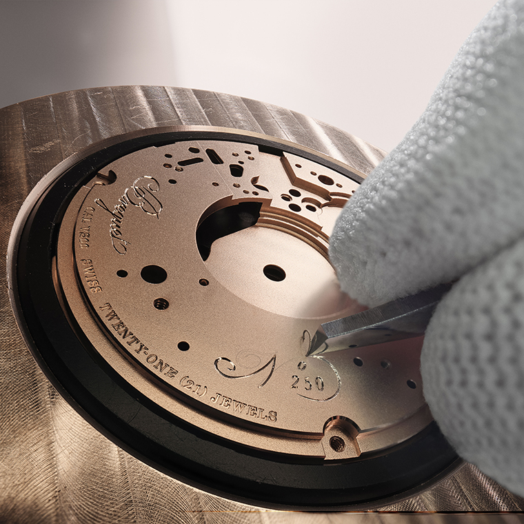 นับเป็นการผสานความคลาสสิกกับความร่วมสมัยอย่างลงตัว เฉดสีทองอมชมพูโทนอบอุ่นของวัสดุนี้ ได้รับแรงบันดาลใจมาจากสีของทองคําที่ ช่างนาฬิกาในศตวรรษที่ 18 นิยมใช้ ตามแบบฉบับของอับราฮัม-หลุยส์ เบรเกต์ ซึ่งในยุคนั้น โลหะผสมชนิดนี้มีคุณสมบัติเหนือชั้น ทั้งในด้านความ คงทน ทนทาน และความงดงาม ให้นาฬิกายิ่งทรงคุณค่ามากขึ้น