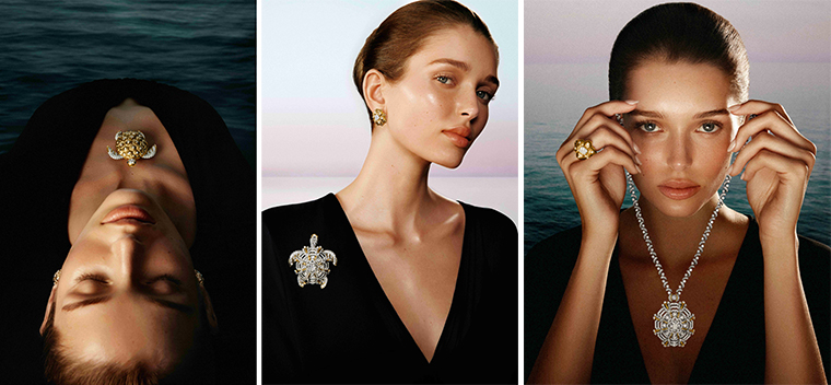 บท Sea Turtle โดดเด่นด้วยลวดลายเพชรและรายละเอียดทองคำ ตัวกระดองเต่าเจียระไนขึ้นรูปทีละชิ้นอย่างประณีตโดยช่างฝีมือของ Tiffany & Co. โดยมีชิ้นไฮไลท์คือจี้เต่าทะเล ที่ซ่อนกลไกสามารถเปลี่ยนเป็นเข็มกลัดได้ สื่อถึงการเดินทางของเต่าจากฝั่งสู่ทะเล และ บท Starfish ถอดรหัสตีความปลาดาวแสนสง่างามใหม่ ออกมาเป็นเครื่องประดับชั้นสูง สีสันแวววาวชวนให้นึกถึงจักรวาล แต่ละชิ้นประดับด้วยทับทิมโมซัมบิก เพชรล้อมทองคำ 18K เพชรทรงโรสคัต และเพชรฝังจิกไข่ปลา เจียระไนด้วยเทคนิคพิเศษ สร้างงานประติมากรรมที่มีมิติซับซ้อน