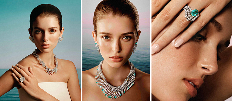 บท Urchin ได้แรงบันดาลใจจากโครงสร้างซับซ้อนของเม่นทะเล ผ่านวิสัยทัศน์การออกแบบของ Schlumberger ซึ่งฟื้นฟูเทคนิคศิลปะจากศตวรรษที่ 19 อย่างการลงยาแบบ Paillonné เพิ่มผิวสัมผัสคล้ายหนามละเอียดอ่อนให้กับดีไซน์ พร้อมสะท้อนประกายรุ้งของท้องทะเลได้อย่างน่าหลงใหล และบท Wave เฉลิมฉลองเกลียวคลื่นมหาสมุทรอันยิ่งใหญ่ ผ่านดีไซน์ประติมากรรมสุดทรงพลัง ชิ้นงานเด่นอย่างสร้อยคอสะท้อนความโอ่อ่าของคลื่นกระทบฝั่ง ประดับด้วยเพชร ทัวร์มาลีน cuprian elbaite และทัวร์มาลีนสีฟ้าสดใส น้ำหนักรวมกว่า 17 กะรัต ถ่ายแรงบันดาลใจจากโครงสร้างอ่อนช้อยและพลังการเคลื่อนไหวในสร้อยคอ Leaves อันเลื่องชื่อของ Jean Schlumberger