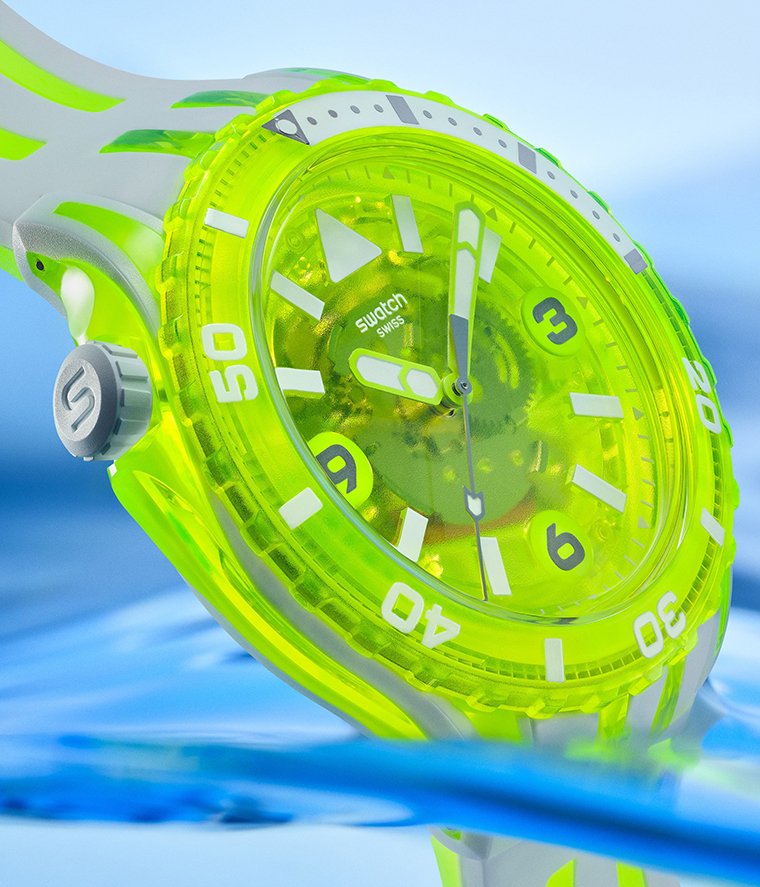 ไม่ว่าคุณจะเล่นเซิร์ฟหรือเดินเล่นในเมือง นาฬิกาเหล่านี้ก็จะโดดเด่นไม่เหมือนใคร เม็ดมะยมตรงตำแหน่ง 10 นาฬิกาช่วยเพิ่มความปลอดภัยในการสวมใส่ และยังเป็นดีเทลที่เป็นเอกลักษณ์ของรุ่นนี้ ส่วนดีเทลเรื่องแสงในที่มืด ทำให้มั่นใจได้ว่าสามารถอ่านเวลาได้ง่ายในทุกสภาพแสง หน้าปัดและตัวเรือนสีโปร่งใสขนาด 44 มม. พร้อมลายนาฬิกาที่มีสัมผัสนุ่มเรียบเนียนในสีสันที่แตกต่างกันทั้ง 5 สี ไม่ว่าจะเป็นสีดำ สีขาว สีฟ้า สีแดง และสีเหลือง โดยนาฬิกาแต่ละเรือนในคอลเลกชัน Swatch SCUBAQUA ได้รับแรงบันดาลใจและตั้งชื่อตามแมงกะพรุนสายพันธุ์ที่น่าอัศจรรย์ที่สุดในโลก