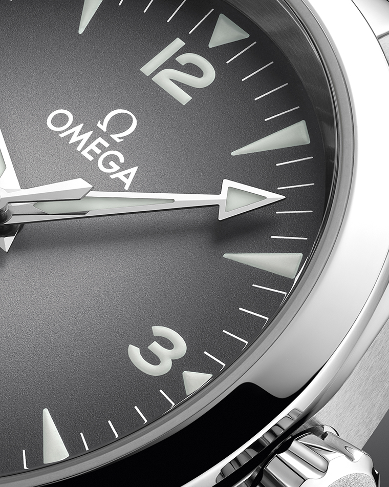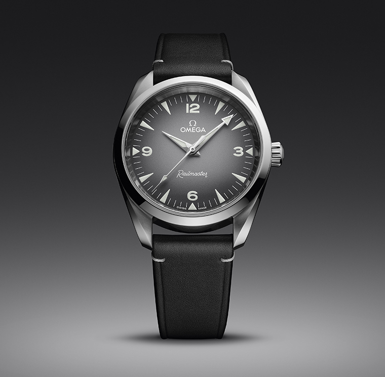 - รุ่นขนาด 38 มม. ที่มาพร้อมกับหน้าปัดสีเทาและไล่ระดับด้วยสีดำ เพื่อให้ยังคงความเรียบหรูเฉกเช่นเดียวกับนาฬิการุ่นดั้งเดิม หน้าปัดจึงปราศจากข้อความใดใดยกเว้นตราสัญลักษณ์ OMEGA และชื่อ Railmaster หลักชั่วโมงกับหลักเลขขนาดใหญ่ถูกพิมพ์ด้วยสารเรืองแสง Super-LumiNova สีขาวซึ่งมอบความชัดเจนในการอ่านค่าได้อย่างยอดเยี่ยมได้ทุกโมงยาม สามารถเลือกเติมเต็มเรือนเวลารุ่นนี้ได้สองแบบทั้งสายหนังสีดำหรือสายนาฬิกาสแตนเลสสตีลโดยมาพร้อมกับข้อสายที่ผ่านการออกแบบใหม่เพื่อเพิ่มความแข็งแรงและยังเลือกปรับความยาวได้อย่างสะดวก