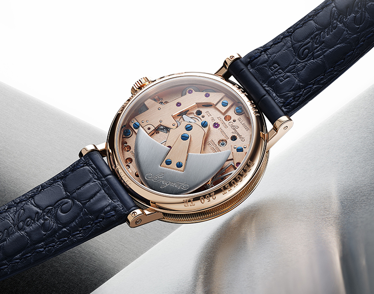 โรเตอร์ทรงพระจันทร์เสี้ยวที่ผลิตจากแพลทินัมขัดแต่งลายเส้นแนวตั้งนี้ ได้แรงบันดาลใจจากการออกแบบของอับราฮัม-หลุยส์ เบรเกต์ ผู้บุกเบิกการใช้แพลทินัมในการสร้างสรรค์นาฬิกา โดยนำมาใช้เพื่อเพิ่มประสิทธิภาพในการไขลานอัตโนมัติให้กับนาฬิกาที่เขาให้ชื่อว่า “perpétuelle” หรือนาฬิกา “นิรันดร์” ซึ่งเป็นหนึ่งในนวัตกรรมแรกเริ่มของอัจฉริยะด้านเรือนเวลาผู้นี้