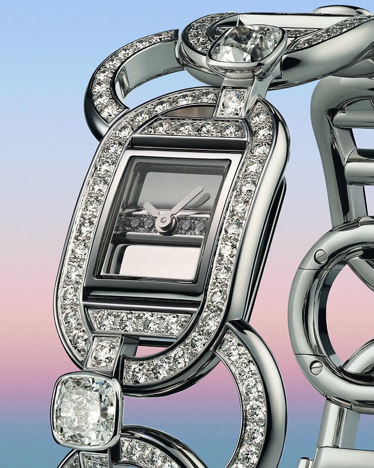 นาฬิกาข้อมือด้วยเอกลักษณ์เฉพาะตัวและทรงเสน่ห์น่าค้นหานี้ดึงดูดใจด้วยโครงสร้างอันซับซ้อน รวมถึงเทคนิคการประดับด้วยเพชร หรือเทอราคอตตาทัวร์มาลีนที่เป็นดั่งอัญมณีศูนย์กลาง พร้อมทั้งรูปทรงโค้งมนราวกับเกลียวคลื่น ขณะเดียวกันการแสดงเวลาอันลุ่มลึกจนแทบมองไม่เห็นนี้ยังผสานเป็นหนึ่งเดียวเข้ากับงานออกแบบสายสร้อยข้อมือซึ่งเสริมทั้งสัมผัสอันสนุกสนานและน่าประหลาดใจ
