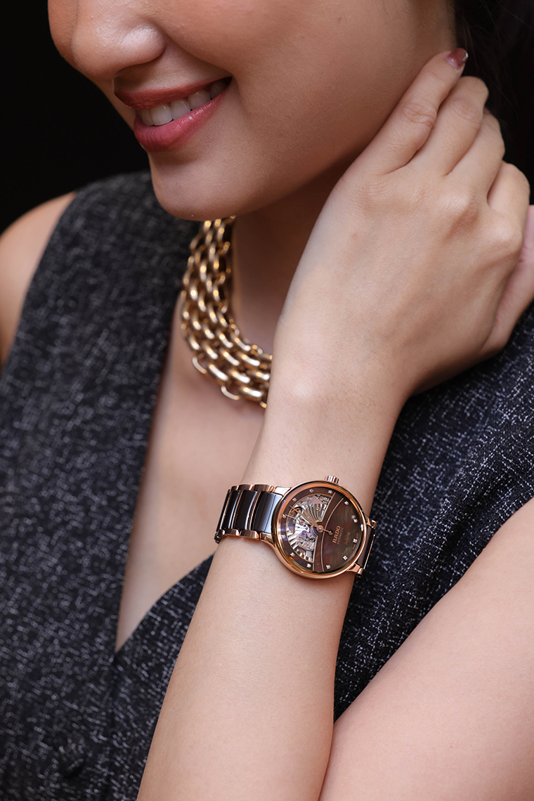ต่อมาที่นาฬิการุ่นยอดนิยมของเหล่าสุภาพสตรี ราโด (Rado) เซนทริกซ์ ออโตเมติก ไดมอนด์ โอเพ่น ฮาร์ท (Centrix Automatic Diamonds Open Heart) โดดเด่นด้วยดีไซน์สไตล์เฟมินีนที่ดึงดูดทุกสายตา ด้วยรายละเอียดอันเป็นเอกลักษณ์ พร้อมช่องที่เปิดโชว์บนหน้าปัดเพื่อเผยให้เห็นกลไกอันพลิ้วไหวอย่างน่าหลงใหลภายในเรือนเวลา โดยนาฬิการุ่นเซนทริกซ์ (Centrix) นั้น สื่อถึงการมาจากจักรวาลของนาฬิกา Swiss made ที่เวลาคือการเคลื่อนไหวและเพชรคือดวงดาวที่กำลังส่องแสงอยู่บนท้องฟ้า นับเป็นการผสมผสานระหว่างสองวัสดุอันอย่างสแตนเลสสตีลและไฮเทคเซรามิกที่สะท้อนให้เห็นถึงความคลาสสิกและความทันสมัยได้อย่างลงตัว โดยเรือนเวลาจากตระกูลนี้แบ่งเป็นรุ่น ‘Super Jubilé’ จำนวน 2 รุ่น ได้แก่ ตัวเรือนสีน้ำตาลรุ่นยอดนิยมสุดหรู R30029942 และตัวเรือนสีขาว R30029932 ที่ตกแต่งหน้าปัดด้วยเพชรแท้จำนวน 86 เม็ด บริเวณส่วนโค้งด้านล่างของสะพานที่ตกแต่งอยู่บนหน้าปัดลวดลายเปลือกหอยมุก และยังมีรุ่น ‘Jubilé’ ที่ประดับเพชรแท้จำนวน 12 เม็ด ได้แก่ เรือนสีขาว R30029922, เรือนสีพลาสม่า R30029912, เรือนสีน้ำตาล R30029902 บนหน้าปัดขนาด 35 มม.