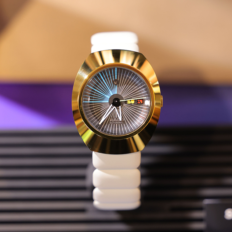 และ ไดสตาร์ ออริจินัล x เตช ชัวร์ฮาน สเปเชียล อิดิชั่น (DiaStar Original X Tej Chauhan Special Edition) รุ่น R12165155 มาในดีไซน์ที่เสมือนหลุดออกมาจากโลกแห่งนิยายวิทยาศาสตร์ ซึ่งนับเป็นผลงานผ่านการร่วมมือกันครั้งที่ 2 ระหว่าง ราโด (Rado) และนักออกแบบชาวอังกฤษ ผู้ซึ่งนำอัตลักษณ์อันโด่งดังของไดสตาร์ (DiaStar) มาออกแบบใหม่ได้อย่างน่าตื่นตาตื่นใจ โดดเด่นด้วยขอบเบเซล (Bezel) ที่ทำจากเซรามอส (Ceramos™) พร้อมเคลือบ PVD สีเหลืองทอง โดยมีกระจกคริสตัลแซฟไฟร์ที่ครอบหน้าปัดสีดำด้านซึ่งมีแทร็คบอกนาทีที่พิมพ์ด้วยสีเงินและสีน้ำเงิน ทั้งหมดนี้ล้วนสะท้อนถึงความเชี่ยวชาญด้านวัสดุของ ราโด (Rado) พร้อมการแกะสลักบนฝาปิดตัวล็อกแบบพับ และวันที่ในแบบอักษรของ Tej Chauhan เข็มชั่วโมงและเข็มนาทีเคลือบด้วยสารเรืองแสงซูเปอร์-ลูมิโนวา (Super-LumiNova®) สีขาว และเข็มวินาทีสีเหลืองเรืองแสง มาพร้อมสายรัดข้อมือยางทรงหมอน ทำงานด้วยกลไกอัตโนมัติ R764 ที่มีพลังงานสำรองยาวนาน 80 ชั่วโมงและสปริงบาลานซ์นิวาครอง (Nivachron™) ทำหน้าที่ป้องกันสนามแม่เหล็ก จึงสามารถรับประกันความแม่นยำและความน่าเชื่อถือได้เป็นอย่างดี