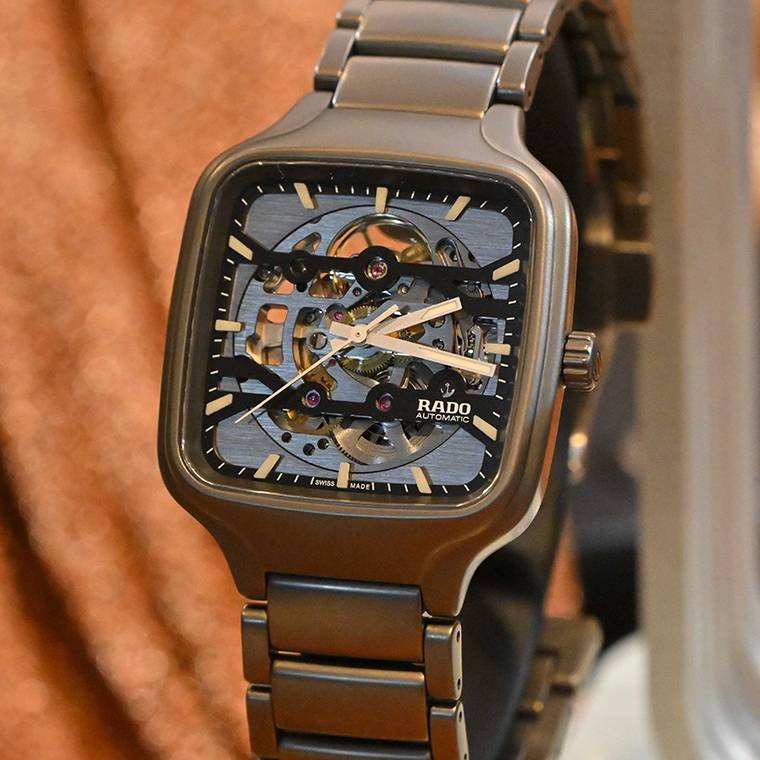คอลเลกชั่นถัดมา ทรู สแควร์ ออโตเมติก สเกเลตัน (True Square Automatic Skeleton) ความสง่างามทางเทคนิคจากการออกแบบทางเรขาคณิตที่ชัดเจนและแม่นยำ ด้วยหน้าปัดที่มีโครงสร้าง 2 ชั้น โดยมีการตัดกรอบที่ถูกจัดวางอย่างชาญฉลาดทำให้ได้มุมมองที่น่าสนใจของกลไกอัตโนมัติ R808 แบบเปลือยพร้อมสปริงนิวาครอง (Nivachron™) และพลังงานสำรองกว่า 80 ชั่วโมง โดดเด่นด้วยสะพานสองตัวที่วางขนานกันบนหน้าปัดช่วยเน้นย้ำถึงความสวยงามของเทคนิคการทำงาน พร้อมเครื่องหมายบอกเวลาที่มีการเดินของเข็มอย่างพิถีพิถัน และการเคลือบสารเรืองแสงซูเปอร์-ลูมิโนวา (Super-LumiNova®) สีขาว บนเครื่องตำแหน่งบอกเวลาหลักชั่วโมง โดยมี 2 รุ่นด้วยกัน ได้แก่ R27196152 ตัวเรือนและเม็ดมะยมพลาสม่าไฮเทคเซรามิกเนื้อแมตต์ และรุ่น R27197152 ตัวเรือนและเม็ดมะยมไฮเทคเซรามิกเนื้อแมตต์