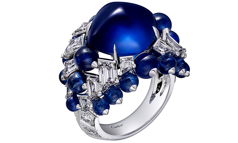 อัญมณีหัวแหวนคือแซฟไฟร์ซีลอนน้ำงามทรงกองข้าว ขนาด 15.35 กะรัตจากศรีลังกาที่งดงามเพียบพร้อมทั้งสีสัน ขนาด และความแพรวพราวรูปทรงพีระมิดสี่หน้าของแซฟไฟร์คือแกนหลักของโครงสร้างแหวนวงนี้ ตำแหน่งแซฟไฟร์ที่จัดวางบนหัวแหวนโดยล้อมรอบด้วยเพชรทรงสี่เหลี่ยมคางหมูและลูกปัดแซฟไฟร์ ทำให้อัญมณีหัวแหวนเปล่งประกายเจิดจรัสสมเป็นอัญมณีเม็ดหลักของชิ้นงาน ผลลัพธ์ที่ได้คือความสมดุลลงตัวระหว่างรูปทรงเรขาคณิตกับรูปทรงจากธรรมชาติ ความโค้งมนกับเส้นสายกราฟิก และจังหวะลีลากับการเล่นแสง