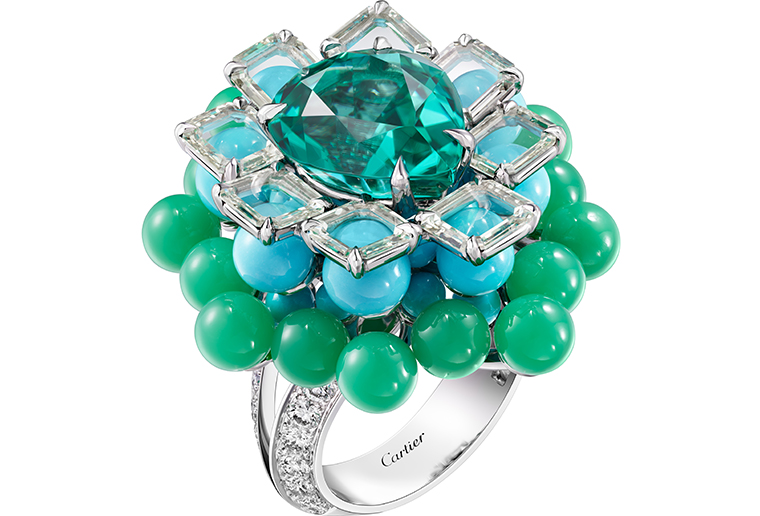 ความวิจิตรอลังการของแหวนมีจุดศูนย์กลางอยู่ที่รูเบลไลท์ทรงคาโบชงขนาด 25.54 กะรัต ที่เปล่งประกายแพรวพราวบนหัวแหวน ทำให้ดูมีชีวิตชีวาอย่างน่าอัศจรรย์มรกตทรงคาโบชงและลูกปัดรูเบลไลท์เรียงรายล้อมรอบอัญมณีเม็ดใหญ่บนหัวแหวน สร้างรูปทรงที่สมดุลบนการผสมผสานของความสมมาตรและความอสมมาตร รูปทรงของชิ้นงานประดับด้วยแผ่นไวท์โกลด์ทรงกลมฝังเพชรที่ถูกจัดวางแทรกระหว่างเม็ดพลอยและเป็นฐานรองรับใต้เม็ดพลอย การตกแต่งด้วยออนิกซ์เพียงเล็กน้อย สร้างจังหวะลีลาที่ขับเน้นความงามของดีไซน์ เสริมพลังเข้มแข็งแฝงความอ่อนละมุนด้วยการผสานสีเขียว-แดง-ดำ ที่คาร์เทียร์ได้ทดลองใช้ในหลากหลายรูปแบบมานานนับศตวรรษ