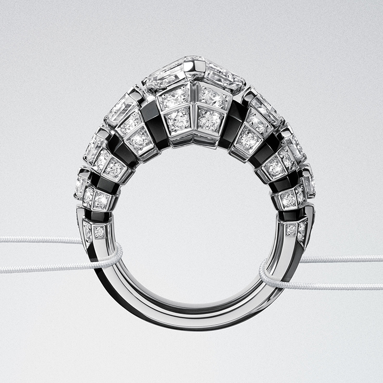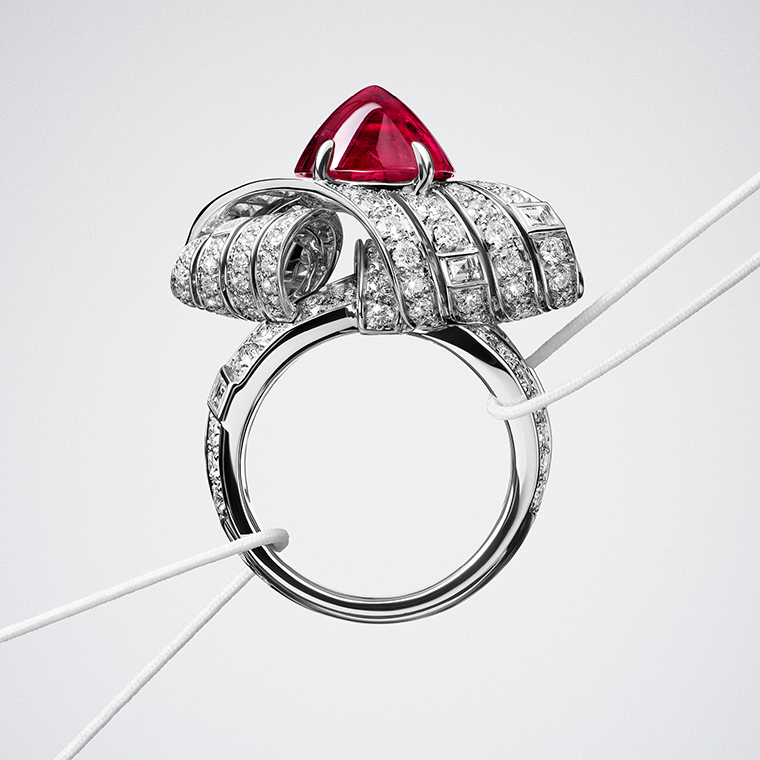แหวนวงนี้ได้แรงบันดาลใจมาจากการศิลปะการผูกโอบิ (obi) คาดเอวชุดกิโมโนแบบดั้งเดิม มอบความรู้สึกอ่อนช้อยลื่นไหลให้กับผลงานการสร้างสรรค์สุดล้ำค่า อัญมณีเม็ดกลางคือทับทิมทรงคาโบชง 6.98 กะรัตจากเวียดนาม ล้อมรอบด้วยริบบิ้นที่ม้วนเป็นวง องค์ประกอบด้านดีไซน์ ไม่ว่าจะเป็นเส้นโค้ง ขอบที่กลมมน ความลื่นไหลและโครงสร้างอันไร้เหลี่ยมมุม ทำให้รู้สึกละมุนละไม ขณะที่ลักษณะทรงโดมและลายฉลุอันแสนประณีตเสริมให้ชิ้นงานอันเปี่ยมไปด้วยความแม่นยำชิ้นนี้ยิ่งงดงามน่าประทับใจ