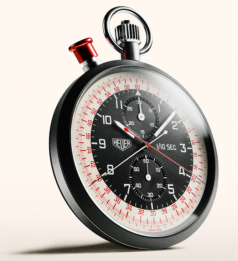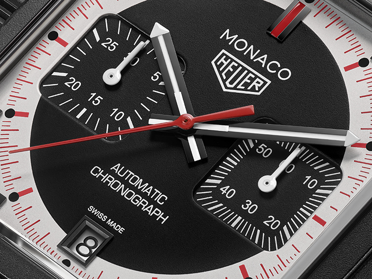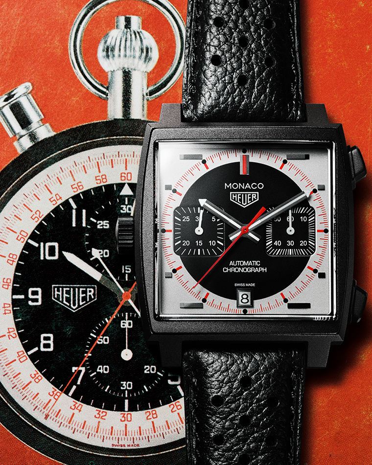 นาฬิการุ่น TAG Heuer Monaco Chronograph Stopwatch ได้ถ่ายทอดดีไซน์ของนาฬิกาสุดวินเทจอย่าง Heuer stopwatches ออกมาอย่างชัดเจน การใช้สีดำ สีขาว และสีแดง ซึ่งเป็นพาเลตต์สีดั้งเดิมของ Heuer ทำหน้าที่เชื่อมโยงโดยตรงกับนาฬิกาจับเวลาที่เคยเป็นนิยามของความแม่นยำในวงการมอเตอร์สปอร์ต สำหรับเรือนเวลารุ่นใหม่ที่ซื่อสัตย์ต่อปรัชญาด้านการออกแบบเพื่อการใช้งานของ Jack Heuer