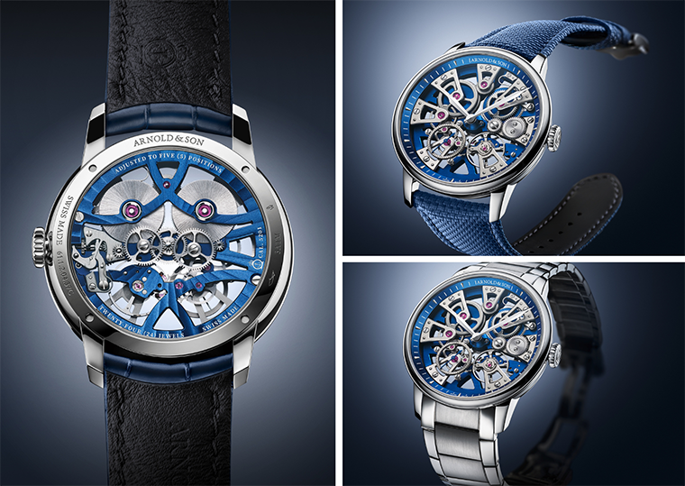 และเพื่อสร้างการตัดกัน ทั้งสะพานจักร เฟืองขับ (ratchets), ซี่จักรของชุดเกียร์ (cogs) หรือแม้แต่จักรกลอก (balance) ได้รับการตกแต่งด้วยการเคลือบแพลเลเดียมเพื่อให้เข้ากับสีของตัวเรือนสตีล ส่วนสายรัดสีน้ำเงินทำจากหนังจระเข้หรืออีกทางเลือกกับสายยางที่ทำให้ตัวเรือนสมบูรณ์แบบ นอกจากนี้ Arnold & Son ยังนำเสนอรุ่นที่มาพร้อมสายสตีลแบบ 3 ข้อ ซึ่งได้รับการออกแบบที่เรียบง่ายช่วยให้การจัดวางตัวเรือนและกลไกมีความสมดุลและดูโดดเด่นอย่างแท้จริง