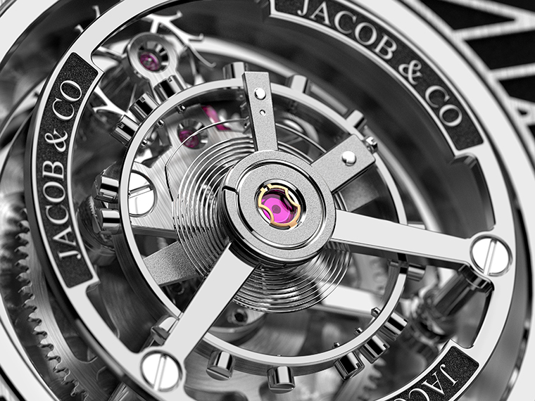 สุดท้ายก็คือ หลังตะแกรงรูปทรงเกือกม้า Jacob & Co. ติดตั้งกลไกนาฬิกาที่ซับซ้อนด้วยทูร์บิญองไร้แกนหรือ ฟลายอิ้ง ทูร์บิญอง (flying tourbillon) แนวดิ่ง เพื่ออ้างอิงถึง Bugatti Tourbillon รถสปอร์ตไฮเปอร์รุ่นใหม่ล่าสุดของ Bugatti และยังเป็นการย้อนราลึกถึงจุดประสงค์แรกของกลไกทูร์บิญองในการเพิ่มความแม่นยาให้กับนาฬิกาที่อยู่ในตาแหน่งแนวตั้งอีกด้วย***